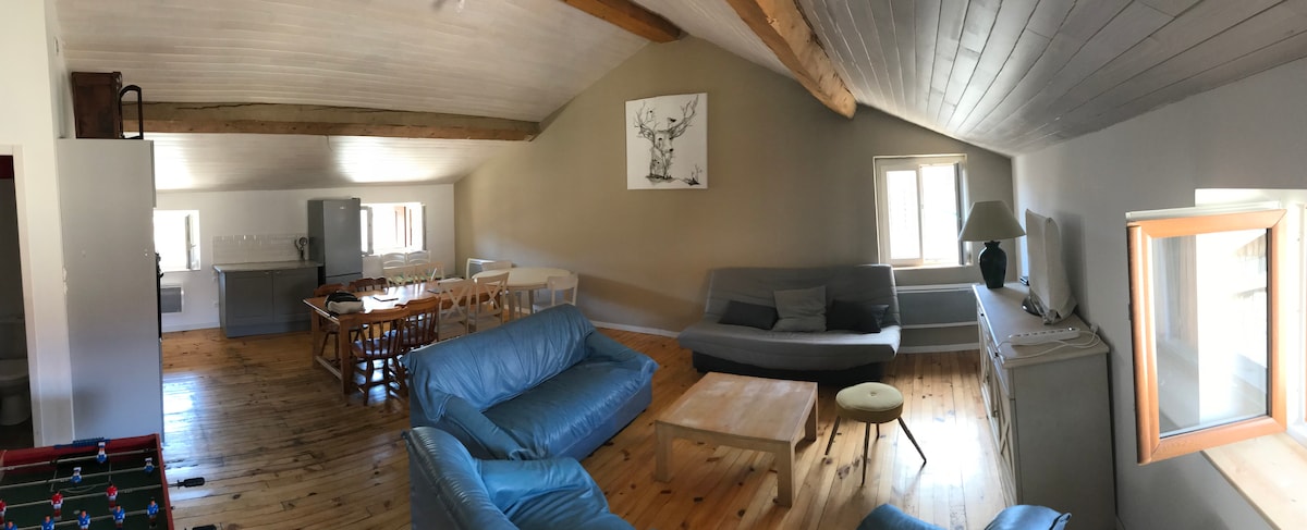 Located outside a small, quiet hamlet (altitude 800 metres) at the end of a winding road, the south-facing barn enjoys panoramic views of the mountains, and is surrounded by fields and woods - with no vis-à-vis! Entirely renovated using ecological materials, the gîte retains all the charm and authenticity of a Pyrenean dwelling, but with all the comfort of a purpose-built gite. The barn caters to everybody – couples, solos, families with children, and walkers with their four-legged friends.