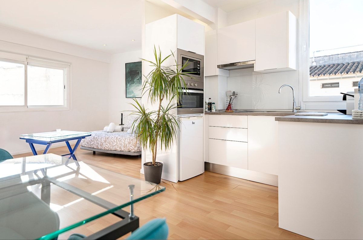 Design fermecător și confortabil la ultimul etaj ideal pentru cupluri, complet renovat și situat ideal chiar în inima centrului vechi. La doar 5 minute de mers pe jos de principala stație de transport public a insulei. Mai sunt 2 unități în aceeași clădire, toate aparțin Poc a Poc Suites turismo interior. Complet echipate: puternic și silențios AC, încălzire, Wi-Fi, TV-DVD, masina de spalat uscator, masina de spalat vase, cuptor, cuptor cu microunde, masina de cafea, ceainic, echipamente de gătit, uscător de păr, fier de călcat + tablă de călcat...tot ce ai nevoie!