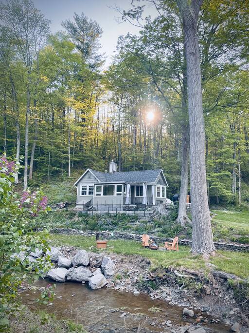The Creek House: o casă complet renovată de 1 bdrm, 1 baie, cu o bucătărie modernă completă și o terasă nouă mare, situată chiar lângă un pârâu care bolborosește pe tot parcursul anului. Pârâul se află la 5 metri de poalele scărilor de pe punte; sună ca oaspeții să doarmă în fiecare noapte. Broaștele, salamandrele, racul și tot felul de forme de viață forestieră abundă. Pârâul șerpuiește prin parcul mixt și parcela împădurită care se termină la o cascadă înaltă de 25’ lățime 6’. Cadă antică cu gheare. Apa poate avea un miros de sulf (vezi mai jos).