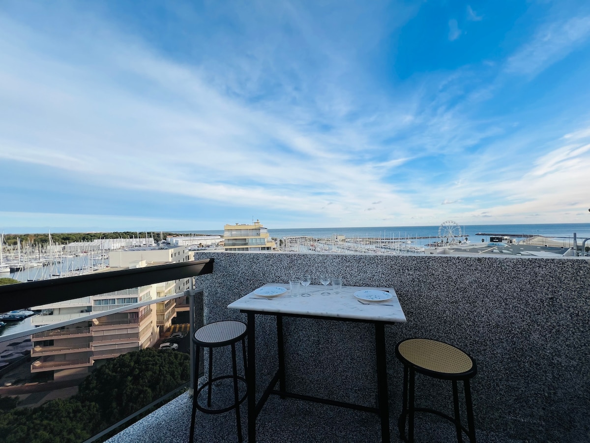 logement refait à neuf situé au 5 ème étage(38m2+10m2terrasse)- 2 ascenseurs- parking privé sur place (hauteur 1m90maxi)-tout confort -vue panoramique sur la mer depuis la terrasse couverte - Pas de vis à vis - Accès direct plage - 1 chambre lit double 140 - 1 coin nuit lit 140 - climatisation - cuisine équipée neuve plaque 4 feux à induction, four chaleur tournante - micro onde - lave vaisselle, lave linge séchant - TV connectée - Draps, serviettes de toilette fournis, wifi fibre-