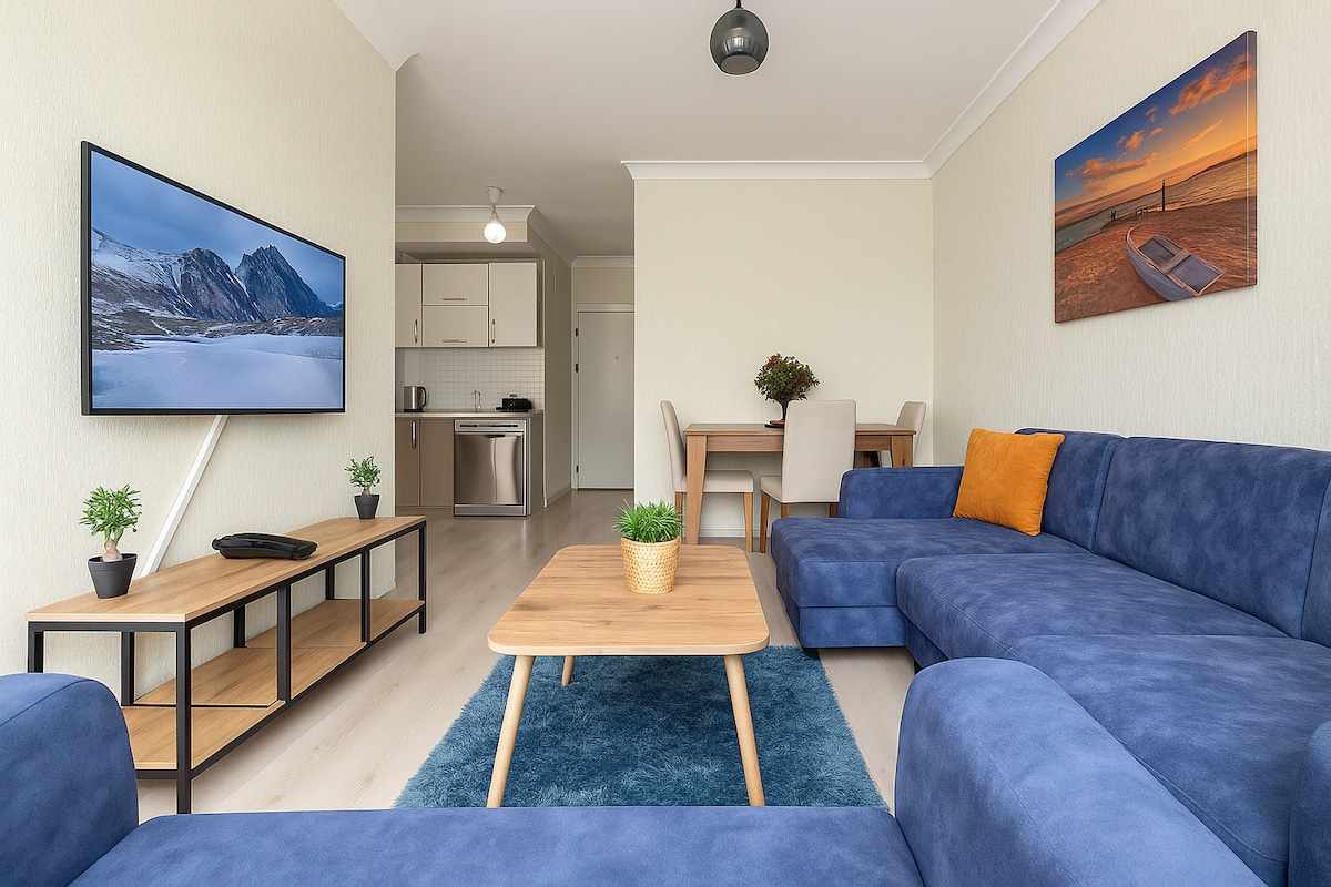 Merkezî konumda bulunan bu sakin yerde sade ve rahat bir konaklamanın tadını çıkarın. Site içerisinde marketler,restorantlar, Starbucks, alışveriş merkezi yürüme mesafesinde. Rahat yatak, klima, akıllı televizyon ile huzurla konaklayabileceğiniz evimde temiz havlular ve örtülerle hijyenle konaklayabilirsiniz. Çamaşır makinası, bulaşık makinası, buzdolabı, fırın, su ısıtıcısı, ocak ve tost makinası bulunur. Yemek yapmak için kullanılan tüm mutfak araç gereçleri mevcuttur.