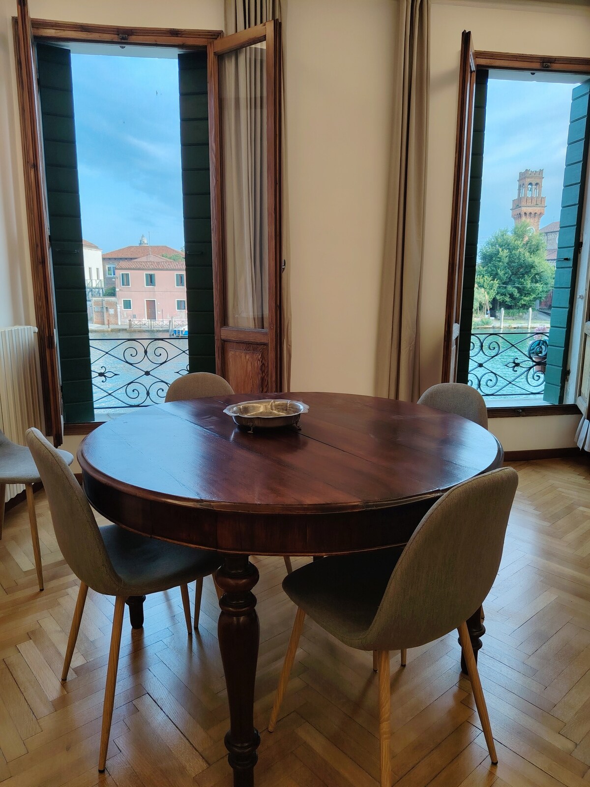 Apartament luminos la etajul al doilea, cu 6 ferestre cu vedere la Marele Canal Murano, ideal pentru cei care caută confort și priveliști unice. La o aruncătură de băț de supermarketul Coop și de stația de vaporetto „Museo”, convenabilă pentru San Marco și Burano. Living spațios, două dormitoare, bucătărie mare utilată și baie. Perfect pentru cupluri, familii sau prieteni care doresc să experimenteze magia autentică din Murano.