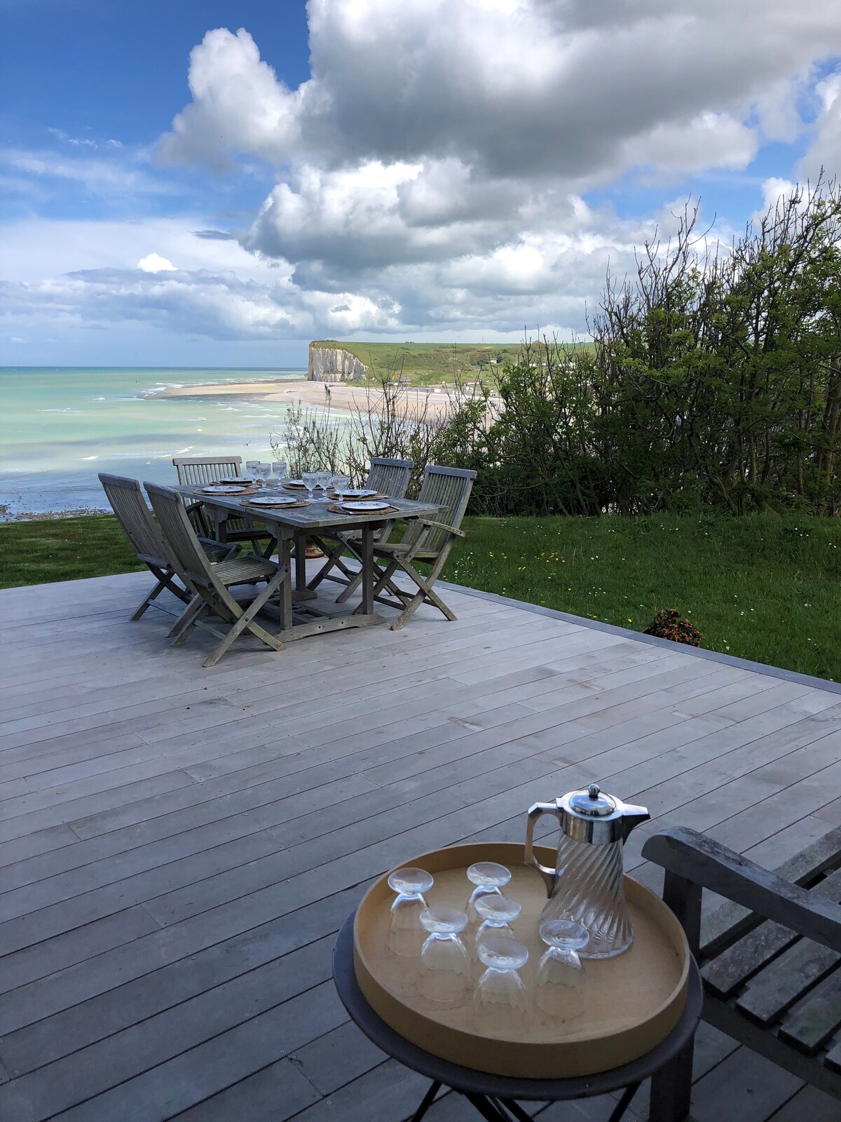 Vilă contemporană cu vedere la mare într-un sat liniștit, terase mari orientate spre sud, la 15 minute de mers pe jos de Fecamp, la 15 km de Etretat. Bucătărie americană complet utilată, 3 dormitoare cu paturi matrimoniale, 1 baie cu duș și cadă cu hidromasaj , 1 sală de duș cu duș mare, 2 toalete, 2 livinguri fiecare cu home cinema și console Xbox, grătar, bonzini foosball, darts, masă de ping, biliard Cornilleau în aer liber.