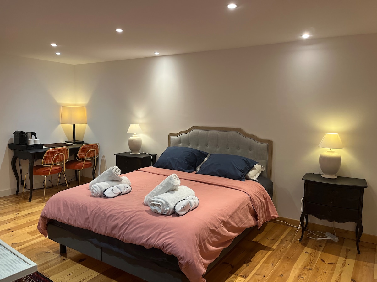 Această locuință ecologică, fără trepte, îți va permite să te deplasezi cu ușurință prin orașul Aurillac între gară și centrul orașului, la 5 minute de mers pe jos. Vei sta la parterul casei noastre mari din piatră. Oaspeții vor avea o intrare independentă și autonomă, o zonă privată în aer liber cu parcare. Toată energia cabanei este produsă datorită unui sistem solar, izolația este ecologică, lenjeria de pat este durabilă și te așteaptă o cadă balneo.