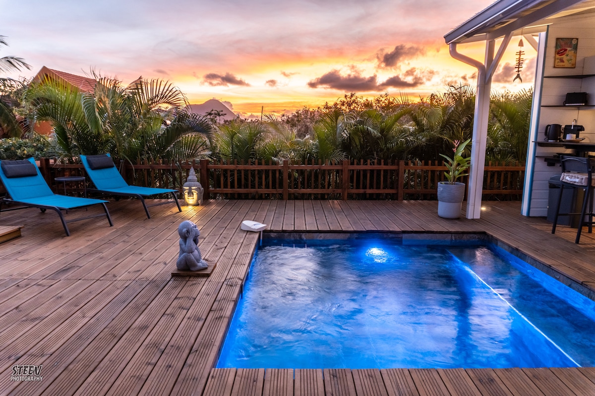 Lounge în spa în timp ce contempla mare. Situat la intrarea în satul turistic Trois-Îlets, într-o reședință liniștită, liniștită și ventilată, acest bungalou din lemn de lux amplasat într-o grădină tropicală este decorat într-un spirit intim și zen. Protocolul NOSTRU pentru sănătate Covid19 garantează siguranța turiștilor noștri. Acesta este disponibil la cerere. Locația bungalourilor asigură distanțarea socială necesară pentru liniștea ta. Acces autonom posibil prin intermediul cheii.