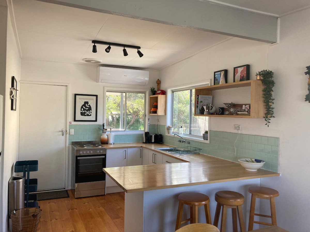 Suită S/C cu intrare proprie, ideală pentru șederi mai scurte. Cuprinde camera de zi, dormitor separat (1 x pat QS), baie. Chicinetă cu cuptor cu microunde, frigider de bar, aparat Nespresso, tigaie electrică mică, fierbător de apă, prăjitor de pâine. FĂRĂ plită/cuptor Aer condiționat și Wi-Fi Grătar Weber pe terasă privată Netflix, TV și DVD-uri, televizor mic în zona dormitorului 6 minute de mers pe jos până în centrul orașului, 2 minute mai departe până la plajă Produse pentru un mic dejun continental simplu, puse la dispoziție pentru primele 2 zile Lenjerie de pat furnizată Nu se aplică taxe de curățenie Parcare gratuită pe stradă Animalele de companie nu sunt acceptate