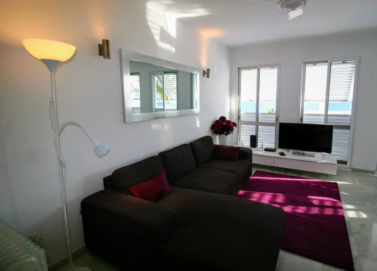 Apartament de 65 m2 situat în centrul orașului Nerja (Plaza de España) la 1 minut de mers pe jos de Balcón de Europa, acces la Playa Calahonda, Playa el Salón și Playa Caletilla. Locuința are o bucătărie mare, avangardistă complet utilată, un living mare cu o canapea extensibilă (140x190), o zonă de luat masa pentru 4 persoane, o baie privată de lux și un dormitor cu pat dublu (160X200). Inclusiv utilizarea în comun a solarului mare situat pe acoperișul clădirii. A/MA/01761