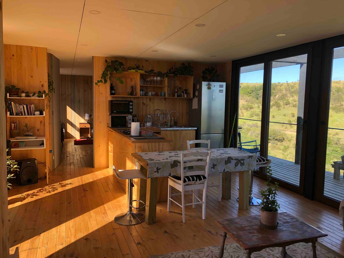 Es una casa con dos piezas, dos baños, living -comedor-cocina, Tiene vista a una quebrada muy inspiradora. Está a 5 minutos en auto del Parque Punta de Lobos: surf y parque. Hay rutas para estar en la naturaleza alrededor y ciclovía. El plan ideal para estar adentro de la casa es recostarse en el sillón, ver películas, escuchar a alguien tocar el piano, mirar como pasa la luz entre los árboles. Afuera hay un fogón con una parrilla para compartir con la estrellas. El terreno es de 1250 m2.