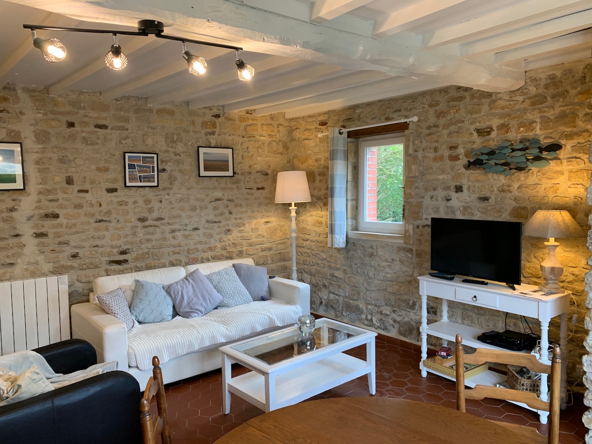 Attenant à la maison principale un logement de plein pied comprenant : un grand salon avec un lit une personne, une chambre avec un lit 140, une cuisine et une salle de bain avec douche et WC. Extérieur : une petite terrasse avec salon de jardin et barbecue. Espace dédié aux véhicules dans la cour intérieure close. La propriété se situe au bout d'un chemin privé. 1km 8 d'Isigny sur mer, tout commerce. 5km de Grandcamp-maisy. Proche des plages du débarquement Omaha beach... De Bayeux à Cherbourg.