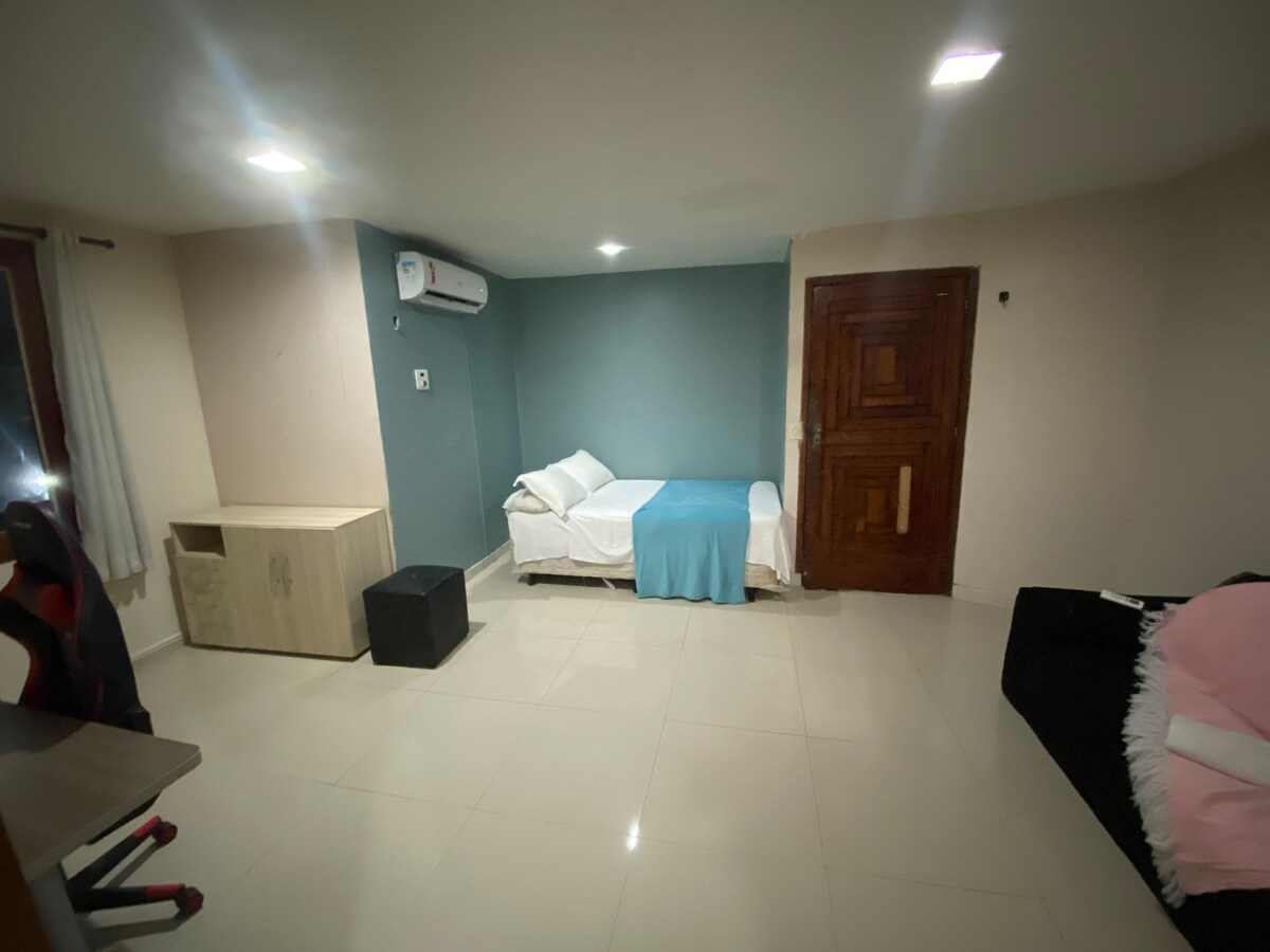 Studio confortabil cu pat dublu și canapea extensibilă, televizor, aer condiționat, bucătărie utilată, spălătorie (mașină de spălat rufe, lângă dormitor), internet rapid (ideal pentru biroul de acasă) și baie privată. Locație privilegiată: - 13 min Aeroport - 6 min Teatrul Amazonas - 8 min Manauara Shopping - 5 min Amazonas, Millenium și Plaza (centre comerciale) - 6 min Arena da Amazônia - 20 min Plaja Ponta Negra - Între cele 2 bulevarde principale din Manaus.
