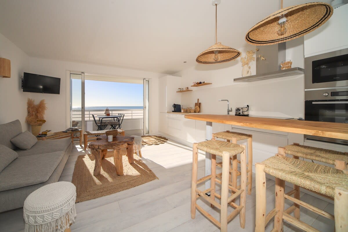 Duplex cu aer condiționat, situat la etajul 2 și ultimul etaj al unei reședințe mici, fără lift, pe prima linie, cu terasă de 10 m2. Este complet echipat (mașină de spălat vase, mașină de spălat rufe, uscător de rufe, frigider-congelator, cuptor cu microunde, 2 plite cu inducție, aparat Nespresso, Wi-Fi). Parcare privată în garaj sub locuință. Situat la 300 m de mers pe jos de centru și cu vedere la plaja de peste drum. Pardoseală pe podea. 1 pat de 160 cm la mezanin și 1 canapea din piele convertibilă în 140 cm.