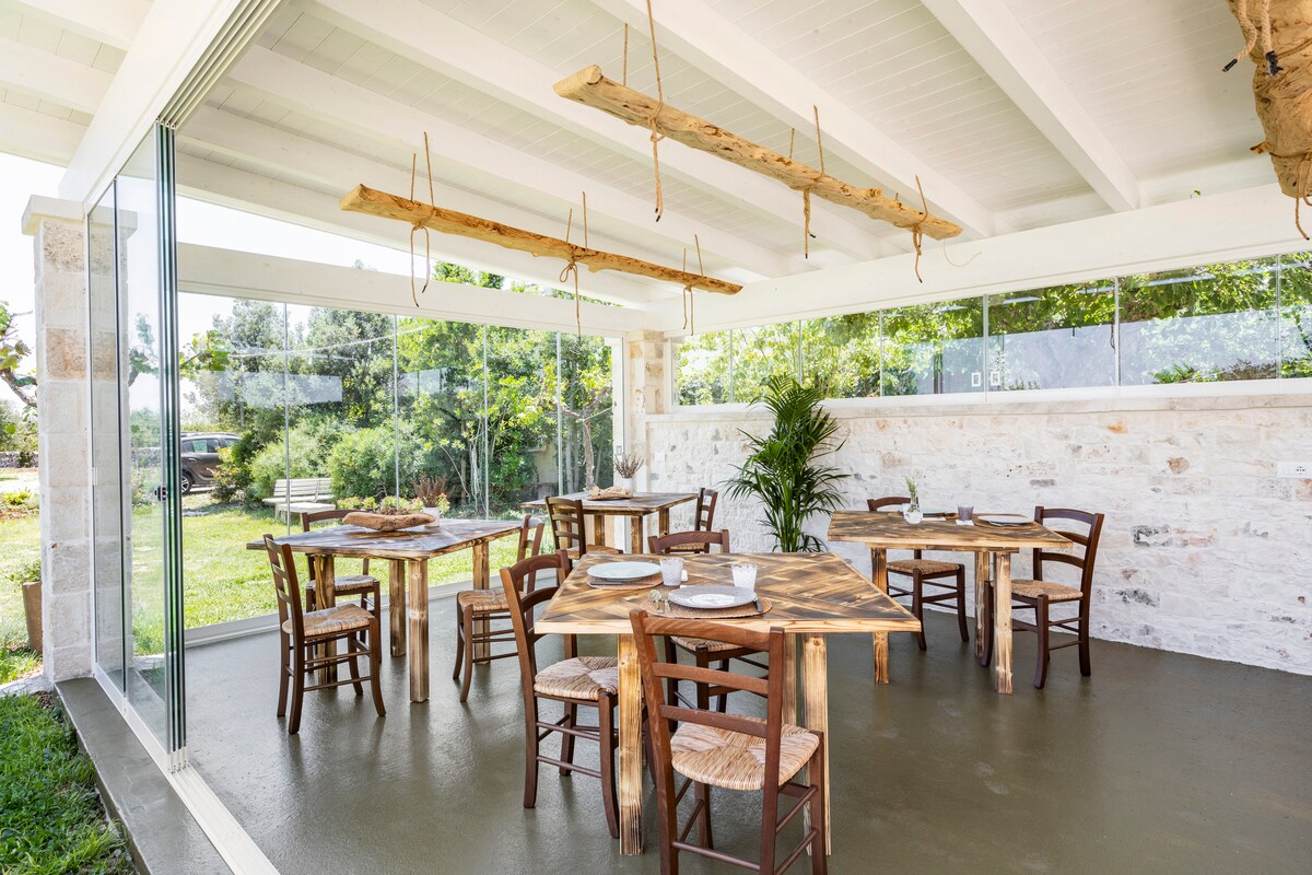 Pensiune într-o Masseria din secolul al XVII-lea, înconjurată de 8.500 mp de livezi de măslini vechi de secole, la doar 20 de minute de plajele din Ostuni. 2 apartamente junior și 2 apartamente cu acces direct și independent din curte. Pereți albi uimitori, curți retrase, arcade, detalii din piatră și pereți fermecători din piatră uscată. Mic dejun cu produse organice, de origine locală: pâine veche din cereale coapte, fructe din livada noastră istorică și prăjituri de casă pregătite zilnic de Patrizia.