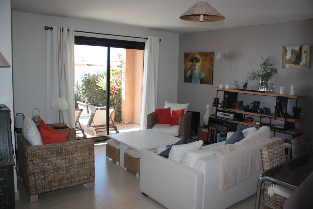 Martine și Philippe au fost foarte grijulii să pregătească un apartament de lux, orientat spre mare, cu acces direct independent prin grădină. Două dormitoare cu aer condiționat, o bucătărie complet utilată, zonă de luat masa. Baie și WC separat. În afara unei zone de relaxare cu vedere la mare și plajă într-o zonă foarte liniștită. Priveliștea este panoramică asupra sărurilor de sare din Hyères, asupra plajei din Almanarre, asupra peninsulei Giens și asupra insulelor aurii: Porquerolles, Port-Cros și asupra insulei Levant.