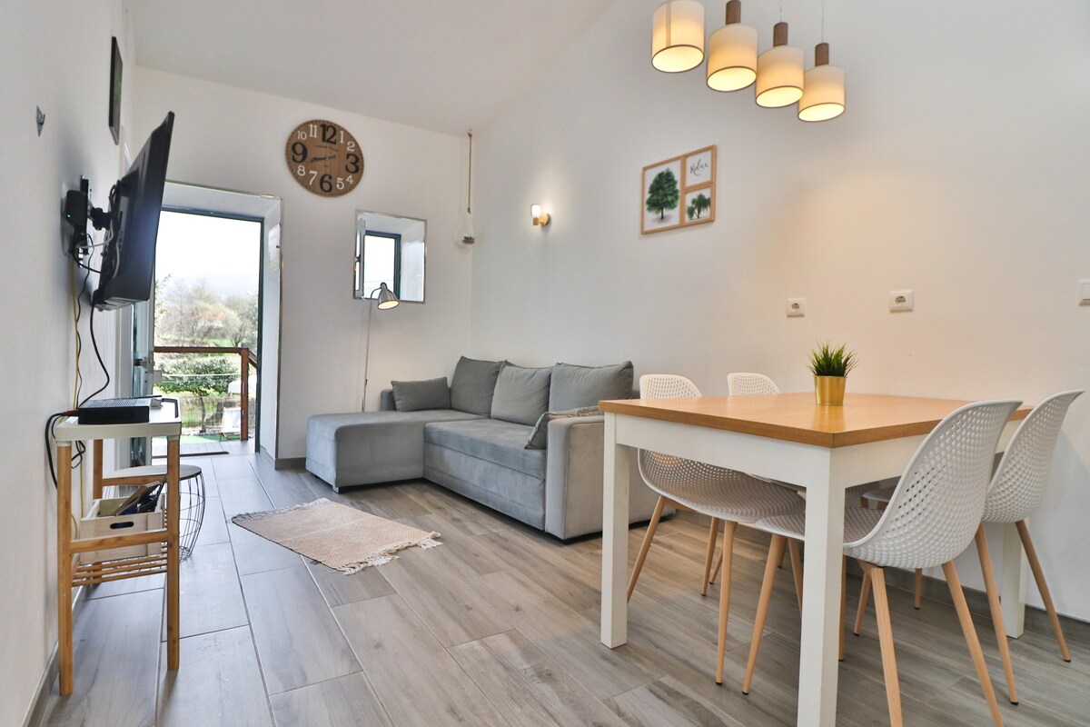 This whole floor has a bedroom with a double bed, another bedroom with two single-beds, sofa bed, fully equipped kitchen and heated toilet. It is heated by Air Conditioning in the living room / kitchen. 40inch Smart TV with 100+ channels, NETFLIX, 100mbs Fiber Internet. Portable outdoor grill with charcoal. Coffee machine, salt, vinegar, olive oil, sugar and coffee. We offer shampoo / gel, towels and clean sheets for each guest. We use Ozono technology for maximum sterilization of the place.