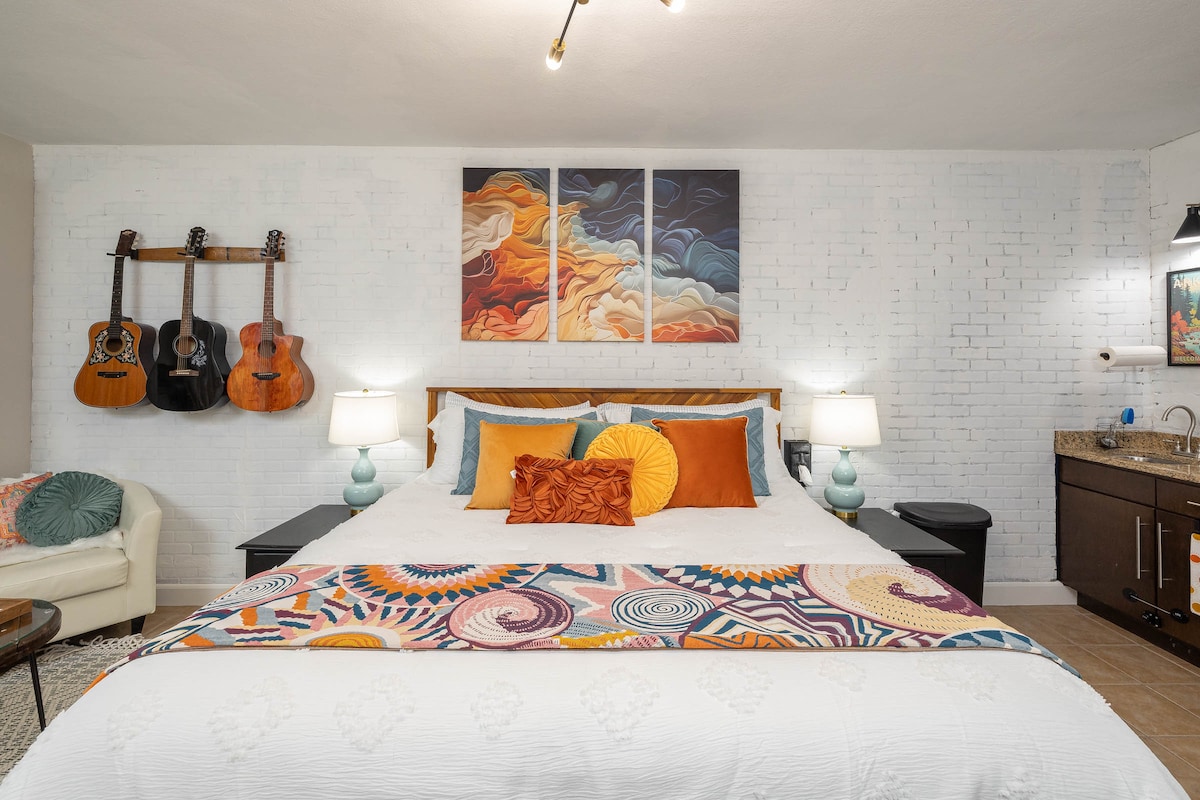 Mergi pe jos până în centrul orașului de la Gypsy Essence — un studio confortabil, potrivit pentru animale de companie, inspirat de Ozark, cu parcare gratuită și un pat matrimonial, la doar 900 de metri de toată acțiunea. Tonurile calde de pământ, texturile naturale, textilele stratificate și detaliile țigănești de autor creează un refugiu calm în inima orașului Eureka Springs. Bucură-te de un living complet aprovizionat sau savurează o cafea pe terasă după ce explorezi străzile întortocheate, magazinele și traseele. Fiecare detaliu este ales în mod intenționat pentru a te ajuta să te simți ca acasă — exact așa cum ar trebui să fie o ședere țigănească.
