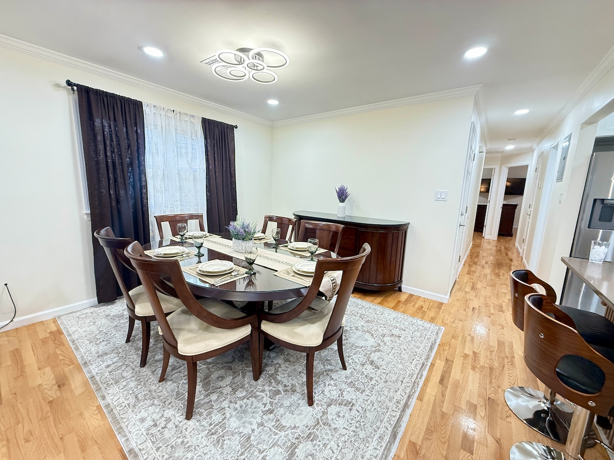 Bucură-te de o escapadă de weekend la centrul nostru de divertisment recent renovat Intrare privată. Parcare pe stradă și 1 alee auto. Viteză Wi-Fi de 1.000 mbps. Cinematograf principal cu proiector de peste 100 inch. Sistem audio în tavan. Bar personalizat, cu blaturi de cuarț și finisaj cu faianță. Bucătărie cu servicii complete, cu electrocasnice (gamă, cuptor cu microunde și frigider). Acces în curtea din spate cu terasă, scaune și grătar. Gustări suplimentare, băuturi, halate cu papuci. 15 min EWR, 30 min NYC