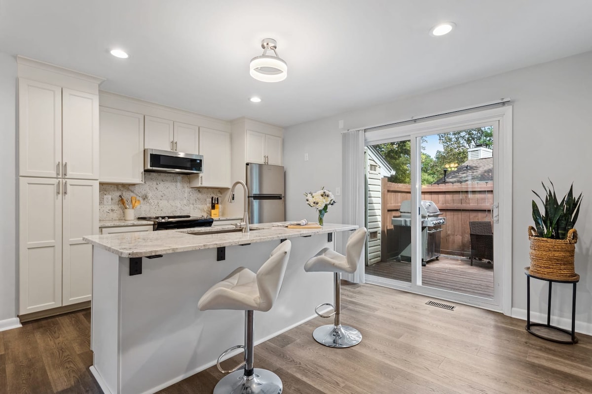 Creează amintiri de neuitat în această locuință spațioasă, frumos amenajată pentru tine + 9 oaspeți! Perfect pentru reuniuni de familie, evenimente sportive și ocazii speciale. Situat în inima centrului orașului Durham, la doar 4 minute de Duke, stadionul Bulls, DPAC și Tobacco Trail. Confortabil în jurul gropii de foc, bucurați-vă de un grătar sau relaxați-vă cu popcorn proaspete și discuri de vinil. Retrage-te în paturi de lux + cearșafuri și mergi la cafeneaua gourmet din AM. Acces gratuit la sala de sport din apropiere cu piscină. Sunt disponibile 4 saltele pneumatice și încărcător EV.