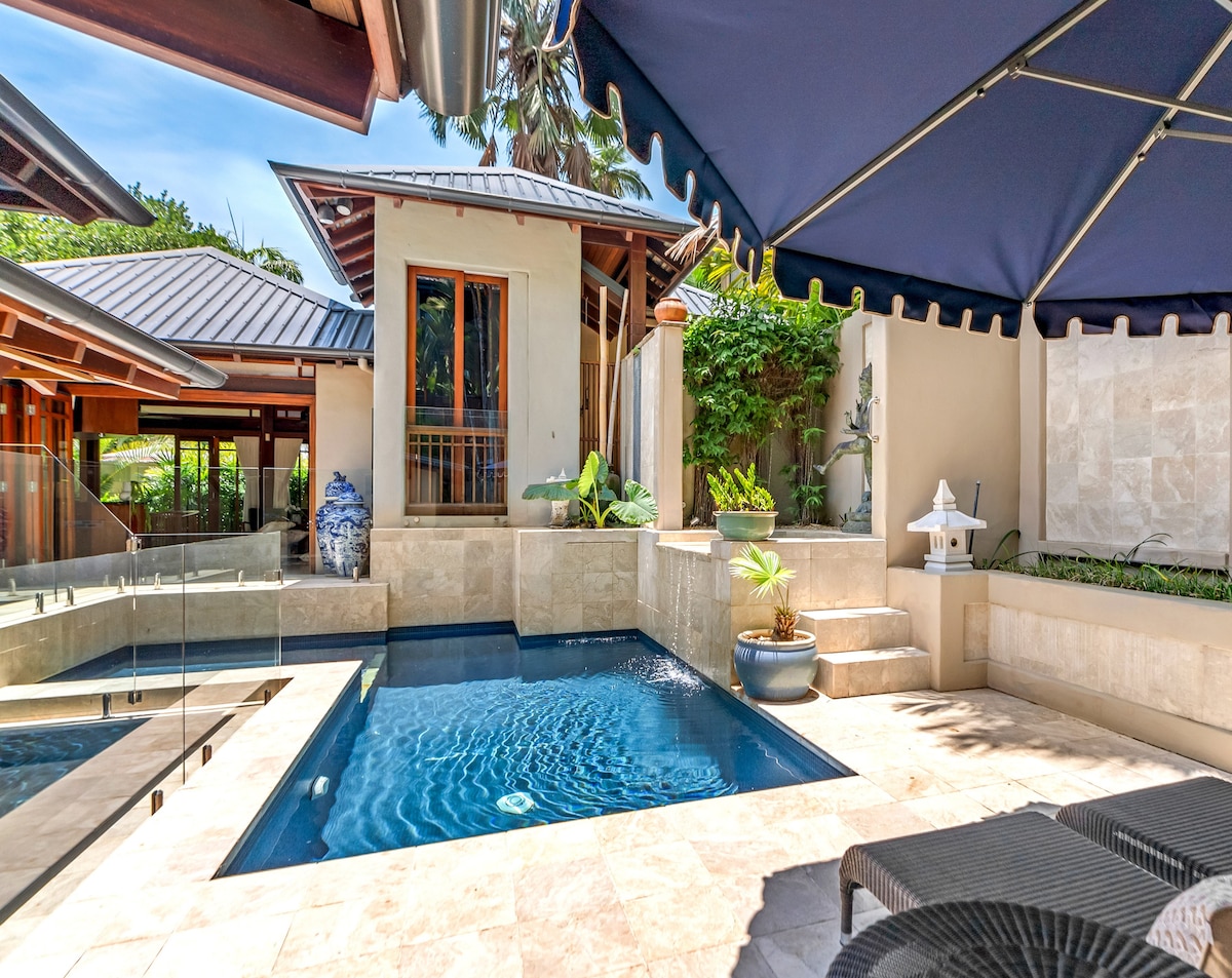 Indah is a spacious Balinese-inspired villa designed for multi-generational families or friends. Four bedrooms all have private ensuites, a 9m saltwater pool, and seamless indoor–outdoor living. Everyone has space to gather and space to retreat. Peaceful, private, and just minutes from Four Mile Beach and Macrossan Street, Indah offers relaxed tropical escapes with room to spread out and enjoy.