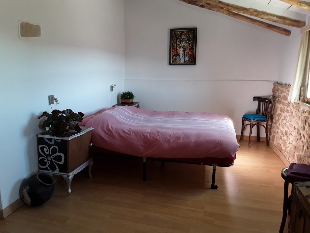 it is a triple room in the garret, with a big bed and 1single bed, wifi and insuite bathroom our guest can USE THE KITCHEN and you have free parking in the street. there is a restaurant in the village and 3 more in 1 km, se trata de una habitación cuadruple , con cama de matrimonio de135 cm, y 1 cama de 90 cm con tv, wifi y baño completo con bañera de hidromasage nuestros huéspedes cuentan con DERECHO A UTILIZAR LA COCINA, tienen aparcamiento gratuito a la puerta de la casa y disponen de información sobre monumentos, mapas de burgos y horarios de monumentos y museos. la casa se encuentra en un pequeño pueblo de 260 habitantes, hay 1 restaurante, y otros 3 a 1 km. pero al estar a 10 min en coche de Burgos capital, hace que tengamos las ventajas de la ciudad con la tranquilidad de un pueblo. en el pueblo se puede ver la estatua del CID CAMPEADOR, nacido aquí, la iglesia de San Miguel Arcángel y el convento de las Clarisas de la Virgen del Espino. hay autobuses a burgos varias veces al día Es un pueblo muy bonito y bien arreglado que tiene el gran honor del ser el pueblo natal de RODRIGO DÍAZ DE VIVAR.