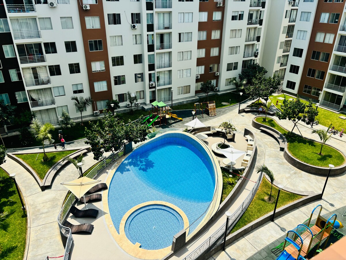 Bucură-te de un duplex nou-nouț situat într-o zonă rezidențială liniștită din Piura. Relaxează-te pe terasă cu priveliști frumoase la apus 🌅 și bucură-te de acces la piscina comună a apartamentului 🏊. Spațiul este complet echipat cu WiFi de mare viteză, aer condiționat ❄️ și un design modern creat pentru confortul tău. Perfect pentru cupluri, familii, prieteni și persoane care călătoresc în interes de afaceri. Poate găzdui între 1 și 6 oaspeți. Rezervă acum și bucură-te de o ședere confortabilă, practică și memorabilă!