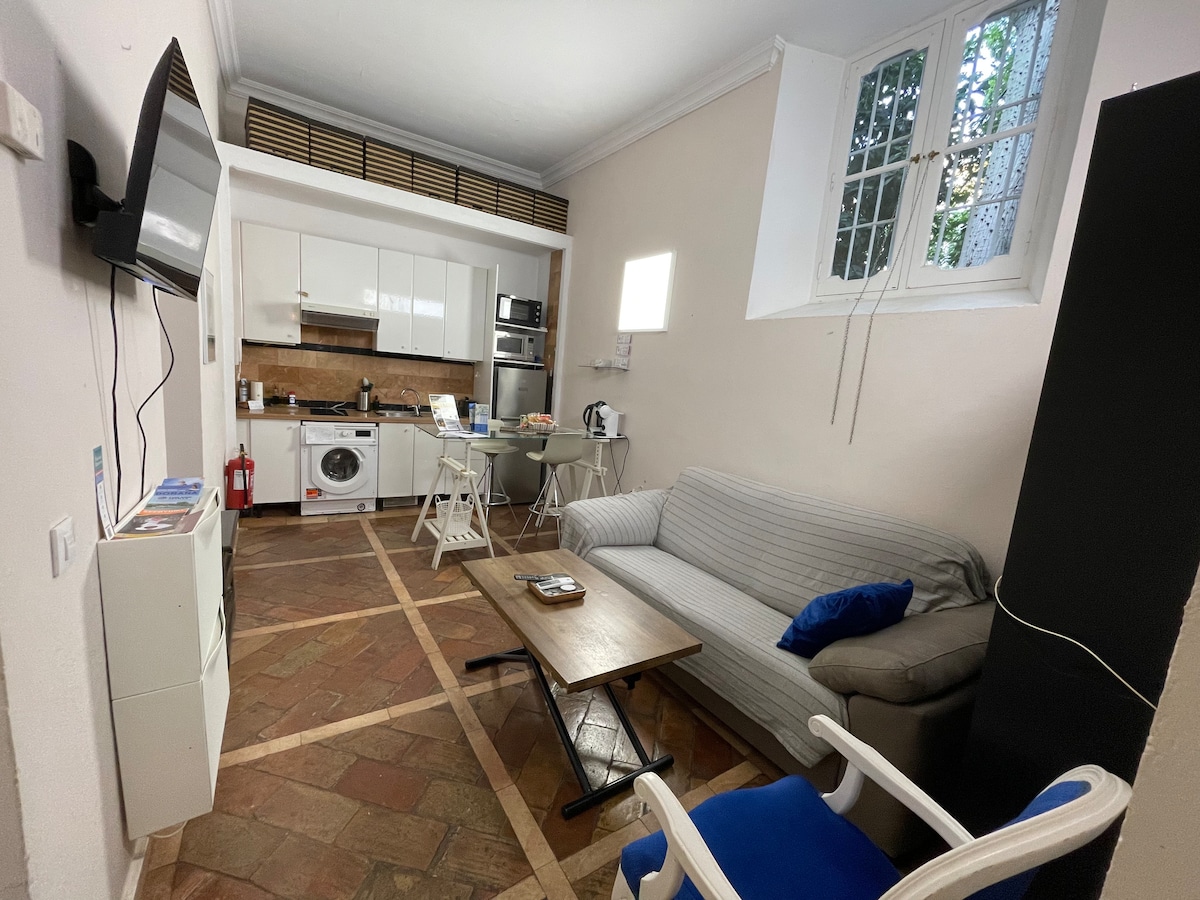 Apartament mic la parter, casă tipică seviliană, pentru 2 persoane. Ferestre foarte înalte în grădină și în interiorul curții pavate. Un dormitor cu pat dublu, o baie privată și un living cu bucătărie integrată. Cearșafuri, prosoape, articole de toaletă și mic dejun. Include parcare acoperită la câțiva metri de clădire. CHECK-IN după ora 14:00. CHECK-OUT înainte de ora 11:00. CHECK-IN INDIVIDUAL: cheile în CUTIA de alături. FUMATUL INTERZIS ÎN APARTAMENT. NU ÎNGRIJIȚI HAINELE ÎN CURTE. DU GUNOIUL LA PLECARE.