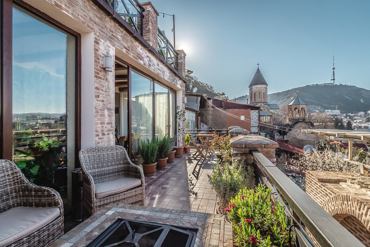 Amazingly located stylish top floor loft apartment in the very center of a historical part of Tbilisi. The apartment can offer you a beautiful terrace with a fantastic view, a cozy fireplace, a big bedroom, AC, bathroom with a bathtub and another bathroom with a shower and a washing machine. The apartment is suitable for four people. Within a walking distance you will find many cafes, bars, restaurants, historical sightseeings, famous sulfur baths and a beautiful Botanical garden.