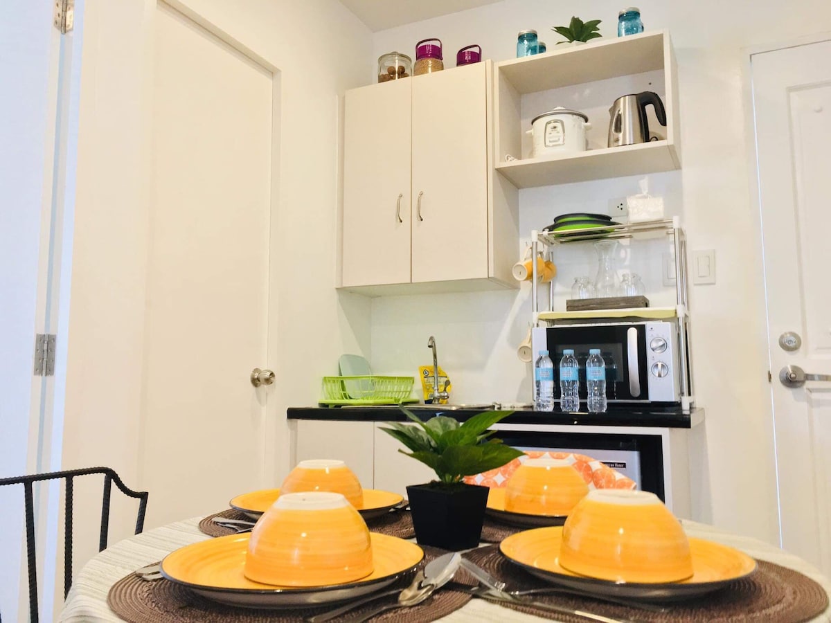 *Lovely 55 sqm 1 bd quality unit in Myna B, separate kitchen layout, cozy bedroom -LR/DR combo, with balcony and sink & patio furniture to dine out. *Unit has hot & cold water in the shower room *55 " Samsung Curved UHDTV, internet connection up to 400 mpbs *Fully equip kitchen w/ toaster, rice cooker, kettle, ref, microwave, air fyer, plates & glasses of your choice, kitchen towels, dish soap. *Free guest parking & with internet.