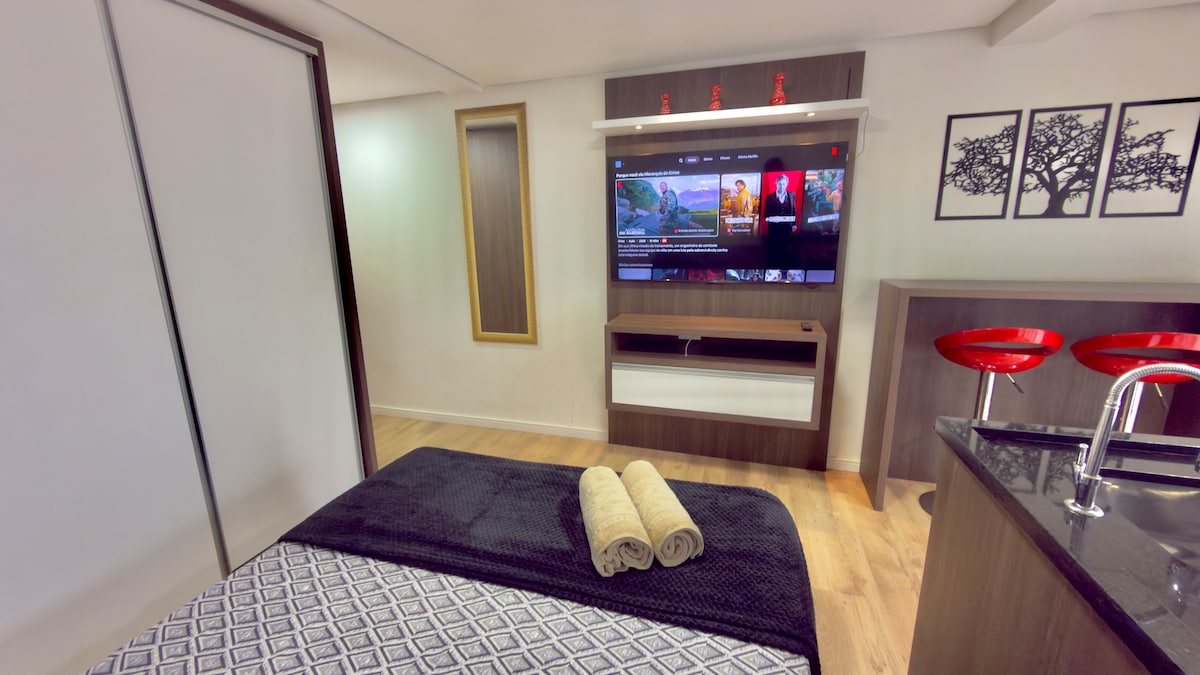 Apartament studio elegant, pregătit să te găzduiască cu afecțiune și căldură!🧖 - Spațiu independent - Pat dublu🛏️ - Lenjerie de pat și de baie 🚿 - Garaj acoperit🚙 - Bucătărie compactă 🍽️ - Smart TV📺 - Balcon cu hamac 🌄 - Uscător de păr - Locație accesibilă, aproape de UCS, Randon, BR 116 și zona centrală a orașului. - Restaurante, piețe, farmacii, sală de sport...în apropiere. - În regiunea strugurilor și a vinului🍇 Apartament conform pozelor! Va fi o plăcere să te întâmpinăm!😊