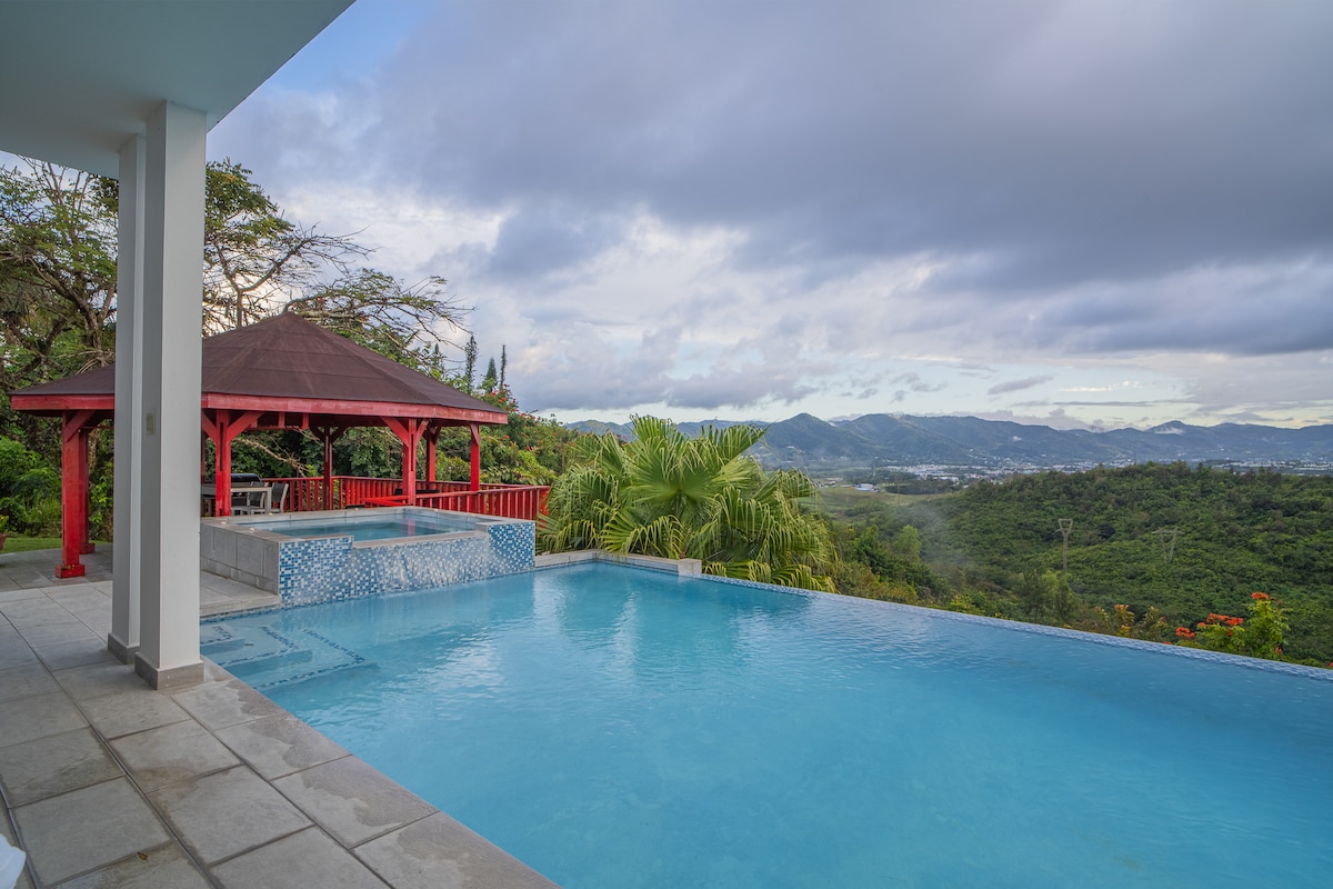 Relaxează-te cu natura frumoasă a câmpurilor din Puerto Rico și priveliștea spectaculoasă a Mării Caraibelor. La 3.000 de picioare combină temperatura ideală, cu unul dintre cele mai frumoase apusuri de soare de pe insulă. Are un acoperiș unde îți poți aprinde focul, te poți bucura de grătar, poți juca domino, poți urmări programul preferat sau te poți bucura de peisajul incredibil. În plus, are o piscină cu un încălzitor, ca o completare perfectă. Crede-mă, nu vrei să pleci !