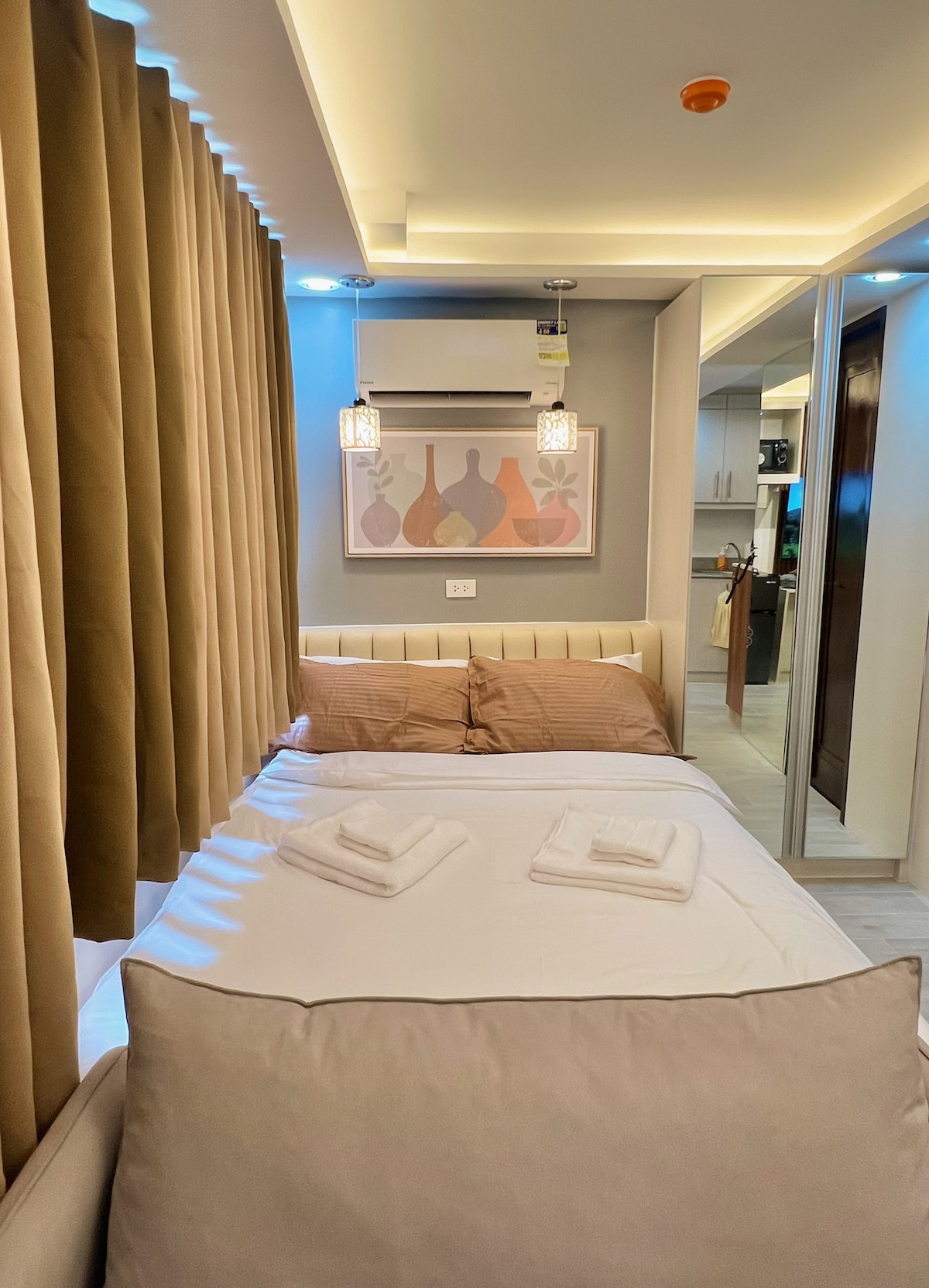 Un studio luminos, de inspirație mediteraneană, în Uptown Cebu's Baseline Prestige, conceput pentru zile ușoare în oraș și escapade pe insulă. Trezește-te în tonuri moi de coastă, lucrează la fibră rapidă, apoi mergi pe jos până la cafenele, mall-uri și spitale la doar câteva minute distanță. Confort lustruit de hotel, cu detalii practice: apă potabilă filtrată, duș fierbinte și o chicinetă complet echipată.