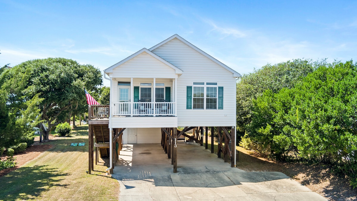 Relaxează-te și bucură-te de priveliștea de pe malul apei din această escapadă minunată. Cadă cu hidromasaj, vatră, doc privat cu lift pentru bărci și apusuri de soare incredibile peste frumoasa cale navigabilă. Relaxează-te, înoată, joacă-te, caiac etc., nu te vei plictisi niciodată. Oferim un covoraș de înot pentru distracție nesfârșită. Zonă mare de parcare în spatele locuinței. Adu-ți barca sau închiriază caiacele noastre și vizitează insula Rechinilor (la 1/4 milă distanță) sau petrece ziua la un banc de nisip frumos! 3 mile până la plaje, 13 mile până la Camp Lejeune, 15 mile până la Acvariu și Fort Macon.