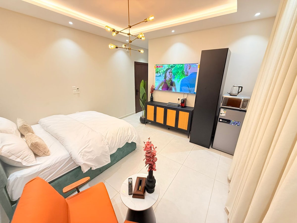 Bine ai venit la X Residence până la Dayf. Această cameră elegantă este locuința ta departe de casă în orașul vibrant Jeddah. Patul nostru matrimonial confortabil va asigura un somn odihnitor de noapte, în timp ce ecranul nostru de 55 inch cu acces la o mare varietate de filme și emisiuni TV. Camera este dotată cu frigider, espressor și cuptor cu microunde pentru confortul tău. De asemenea, oferim prosoape și lenjerie de pat proaspete. Rezervă-ți șederea astăzi!