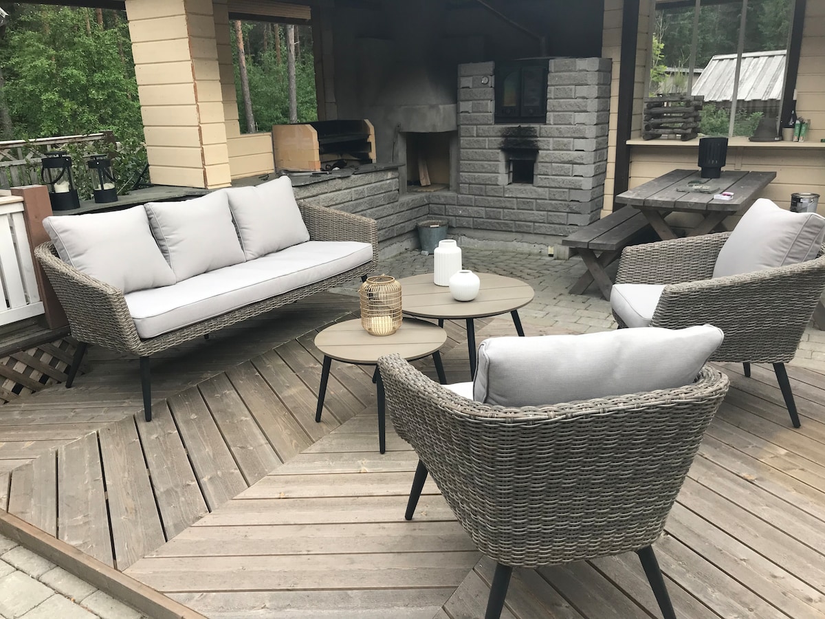 Finalizat în 2007, OKT complet echipat, 140m2 - 4 bdrm, găzduiește 8-10*, saună, 2 WC, cadă cu hidromasaj, șemineu, zone de terasă foarte mari. Locație excelentă lângă râul Lapua, parc de distracții vizavi de Power Park. Loc liniștit la capătul străzii, fără tranzit. Lot mare și grădină 3000m2, curte mare de asfalt 600m2 - susținută chiar și cu mobilier mai mare. Magazine la aproximativ 700 m, pe jos până la 1,3 km până la parcul de distracții. Fumatul interzis înăuntru, fără animale de companie *PATURI: 1 x180cm, 1 x160cm (2x80cm), 3 x120cm, 1x90cm. Potrivit pentru familii
