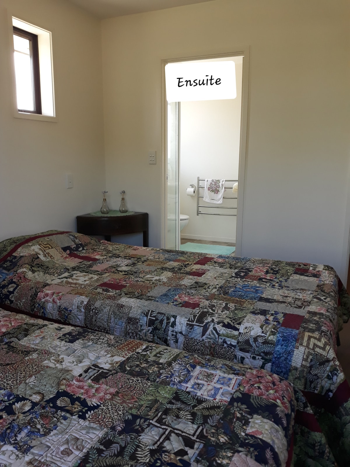 Your private, ensuite room, has a separate entrance through garden. Elevated home with mountain views. A quiet established street in the older part of town. Renovated 1970's house with sunny outdoor deck, off street parking, just a few minutes drive from the centre, 15 minutes walk. Use laundry. Simple breakfast (Cereal, fruit, milk, tea & coffee included.) Pets welcome. Queen bed, quality linen, in a large private room. Helpful, Friendly, Kiwi Hosts! A refrigerator, microwave oven and kettle.