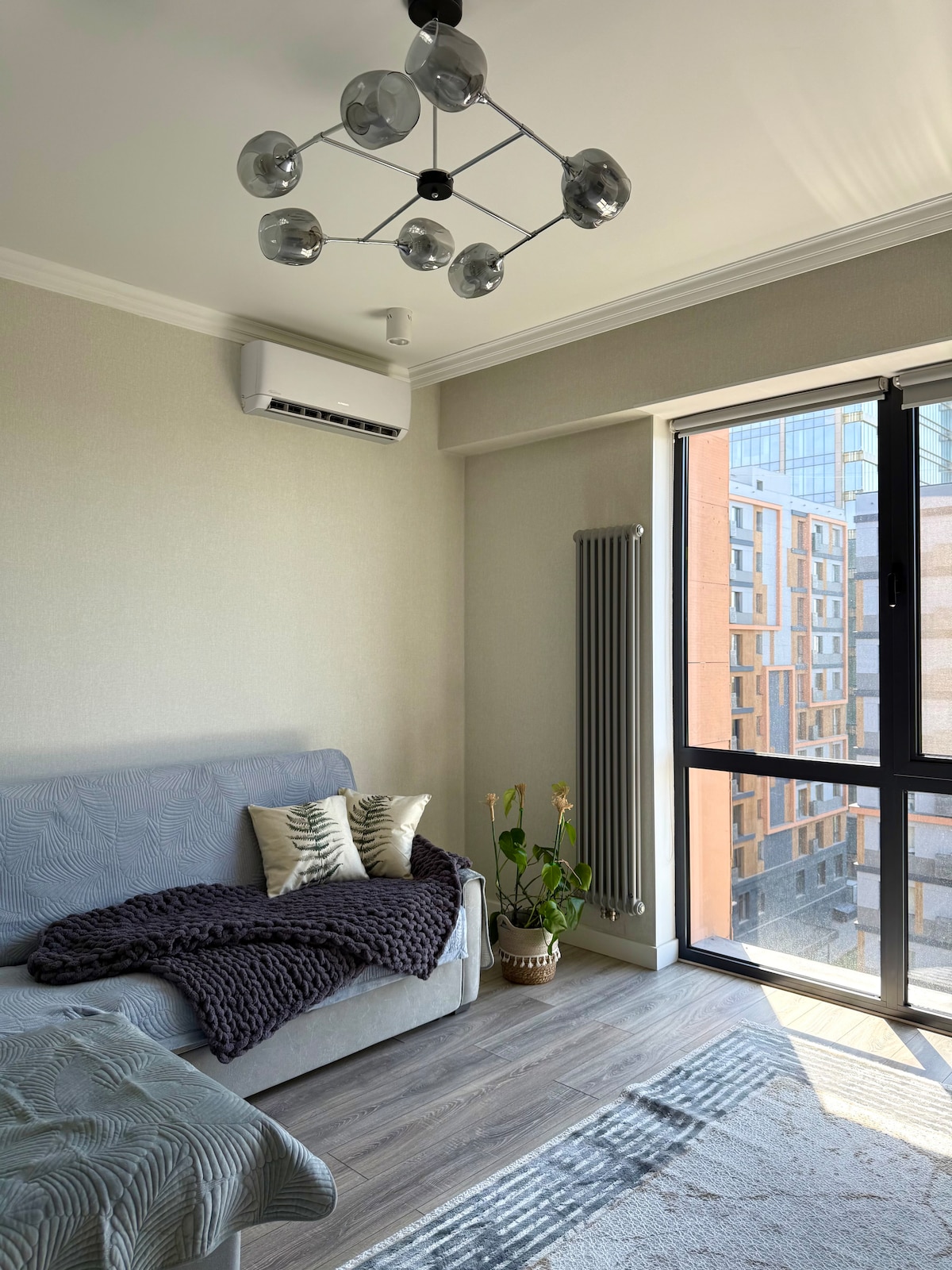 This 50 sq.m studio apartment is located in the heart of the city. Situated in a classic Soviet-era building from 1971, it offers stunning views of the city skyline, the mountains, the TV tower, Kok Tobe, and the iconic Hotel Kazakhstan. The neighborhood is both safe and vibrant, making it ideal for short getaways or extended stays. The apartment is fully equipped with all the essentials to ensure a comfortable and convenient experience.