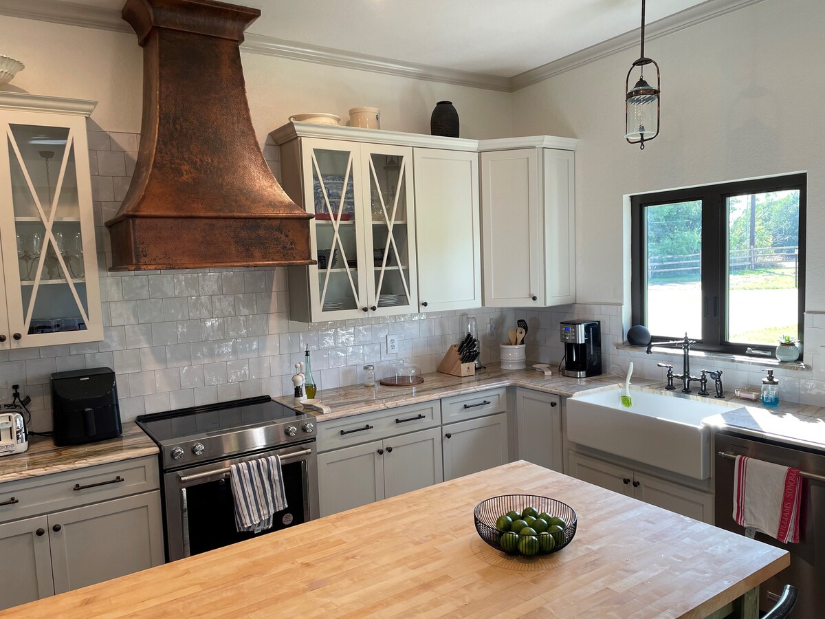Beautiful “Hill Country Modern” home on five acres with a view of our seasonal pond and the valley. Our home incorporates the use of outdoor living space unlike any other. The patio and breezeway are integral parts of the usable space. One side of Sunrise House has a large living room with a fireplace and huge windows. The house has top-of-the-line fixtures and finishes, a mix of new and curated furniture and decor, and beautiful custom art.