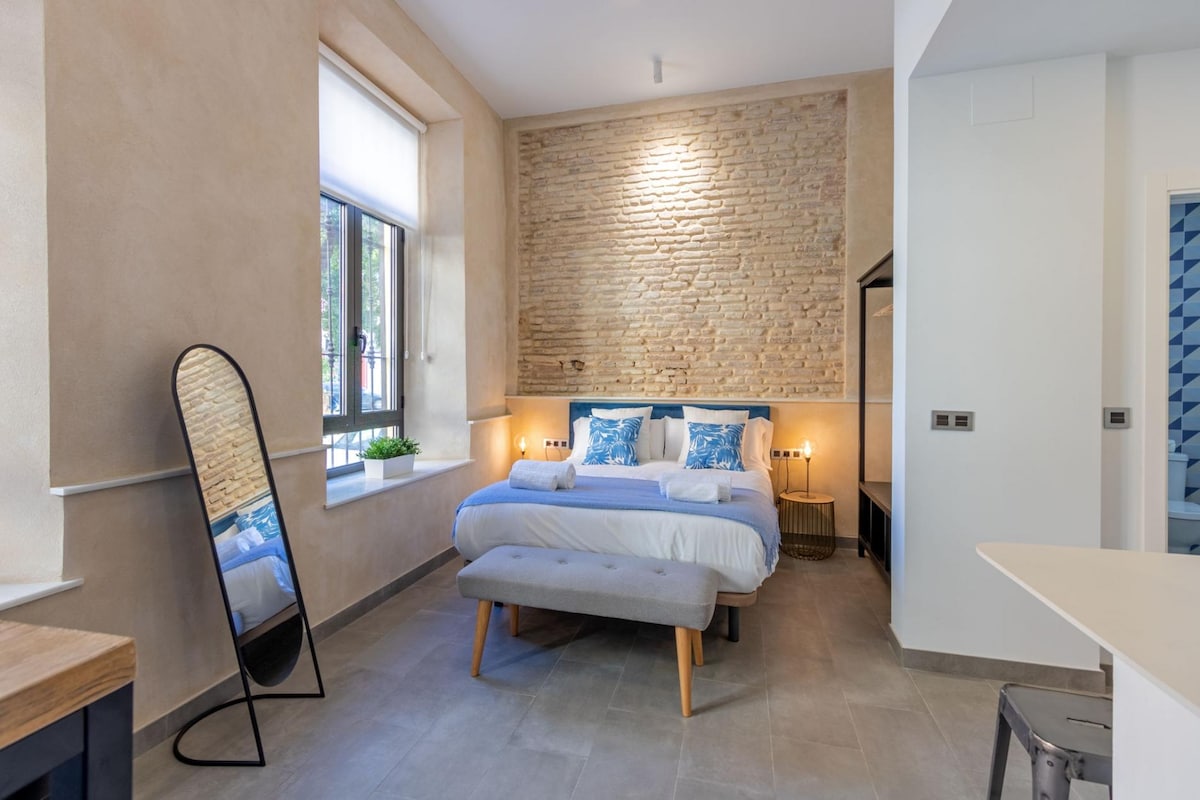 [APARTAMENTE MYLU de PUERTA CATEDRAL] Apartament cu un dormitor ideal pentru familii cu un grad maxim de ocupare de 2 adulti + 1 copil pana la 18 ani. Baie privată deschisă în dormitor. Situat în clădirea noastră, APARTAMENTELE MYLU de PUERTA CATEDRAL, un mediu privilegiat în inima Seviliei. La câțiva metri de Catedrală și de Real Alcázar, cele mai vizitate două monumente din oraș. Terasă de uz comun în clădirea cu piscină.