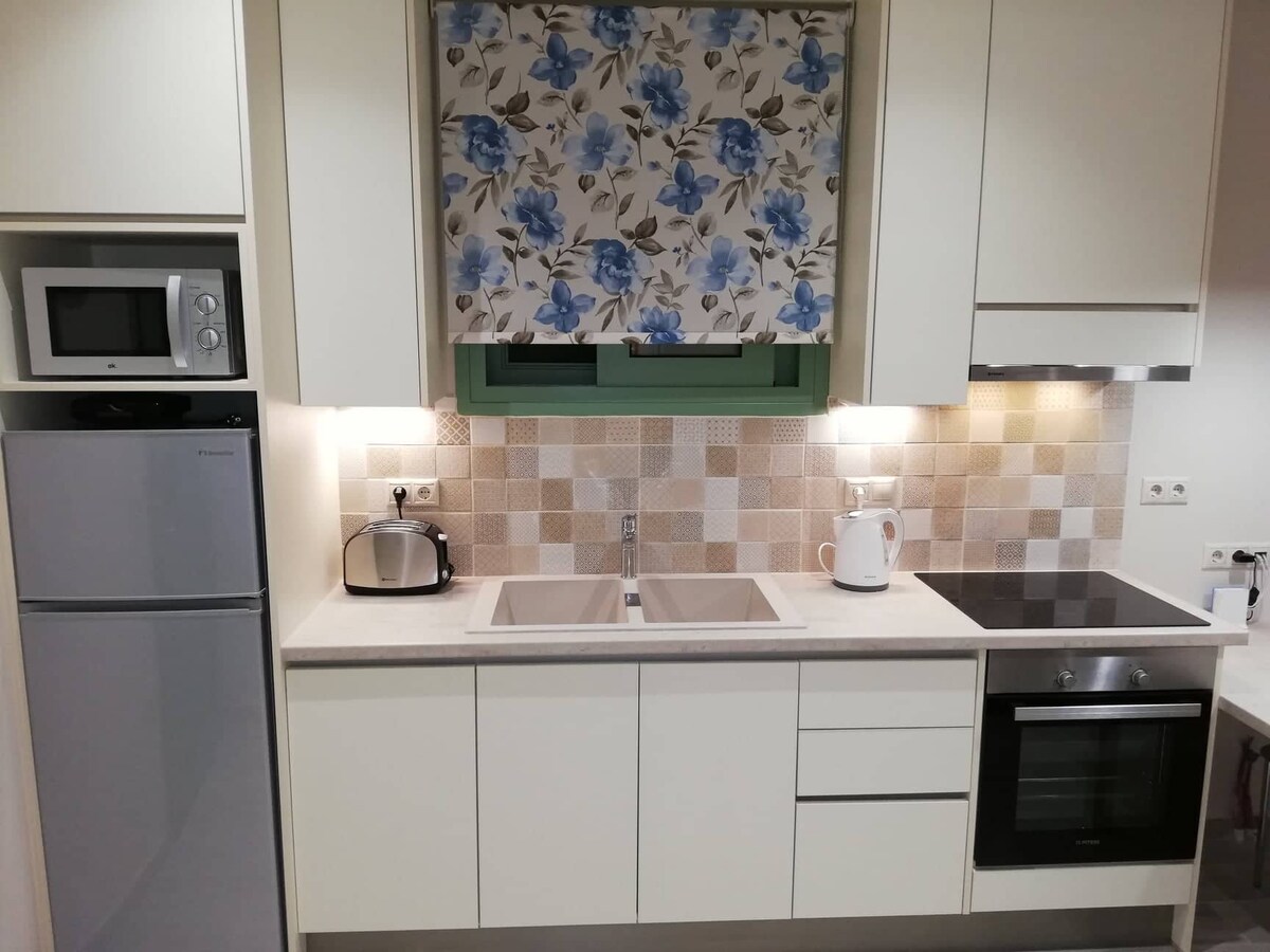 Luminos și spațios, acest minunat apartament cu un dormitor este situat pe o stradă liniștită, la câțiva metri de Piața Centrală din Argostoli. Decorat frumos într-o paletă moale, aceasta este alegerea perfectă pentru cupluri sau o familie de trei persoane, care doresc să se bucure de vacanțe într-un mediu frumos în inima orașului. Acesta dispune de un balcon şi toate facilităţile care garantează un sejur plăcut: aer condiţionat, bucatarie complet utilata, pat dublu, pat pliant single pentru persoana a 3-a, masina de spalat rufe etc