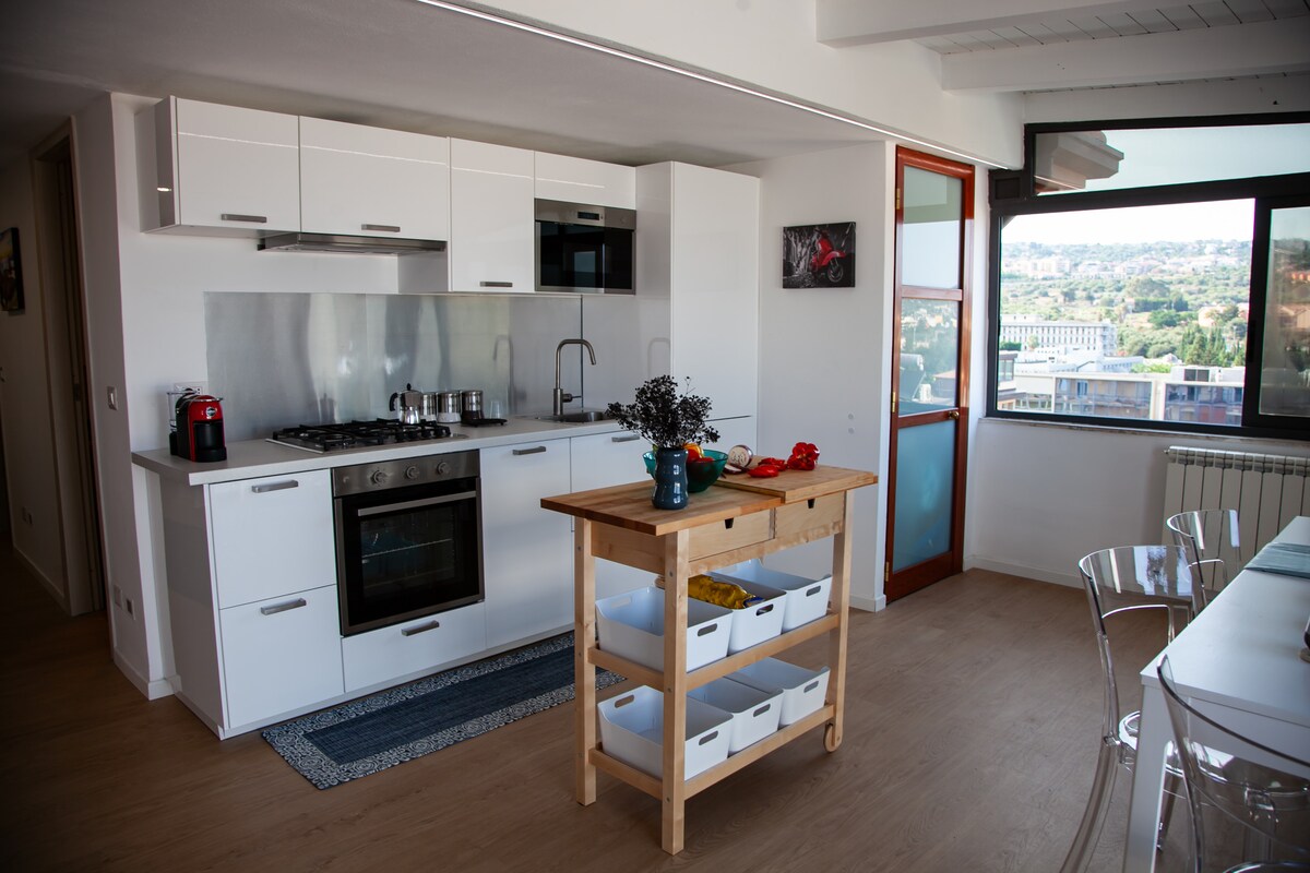 Golful care dă numele orașului, cu stânca sa de lavă, este cadrul pentru acest fermecător penthouse cu terasă, de unde este posibilă admirarea întregii panorame etneene. Apartamentul, situat într-o reședință înconjurată de verdeață, este confortabil și liniștit. Se află într-o zonă strategică a orașului, de unde se poate ajunge, în câteva minute, la destinații importante precum gara, aeroportul, malul mării și centrul istoric al orașului.