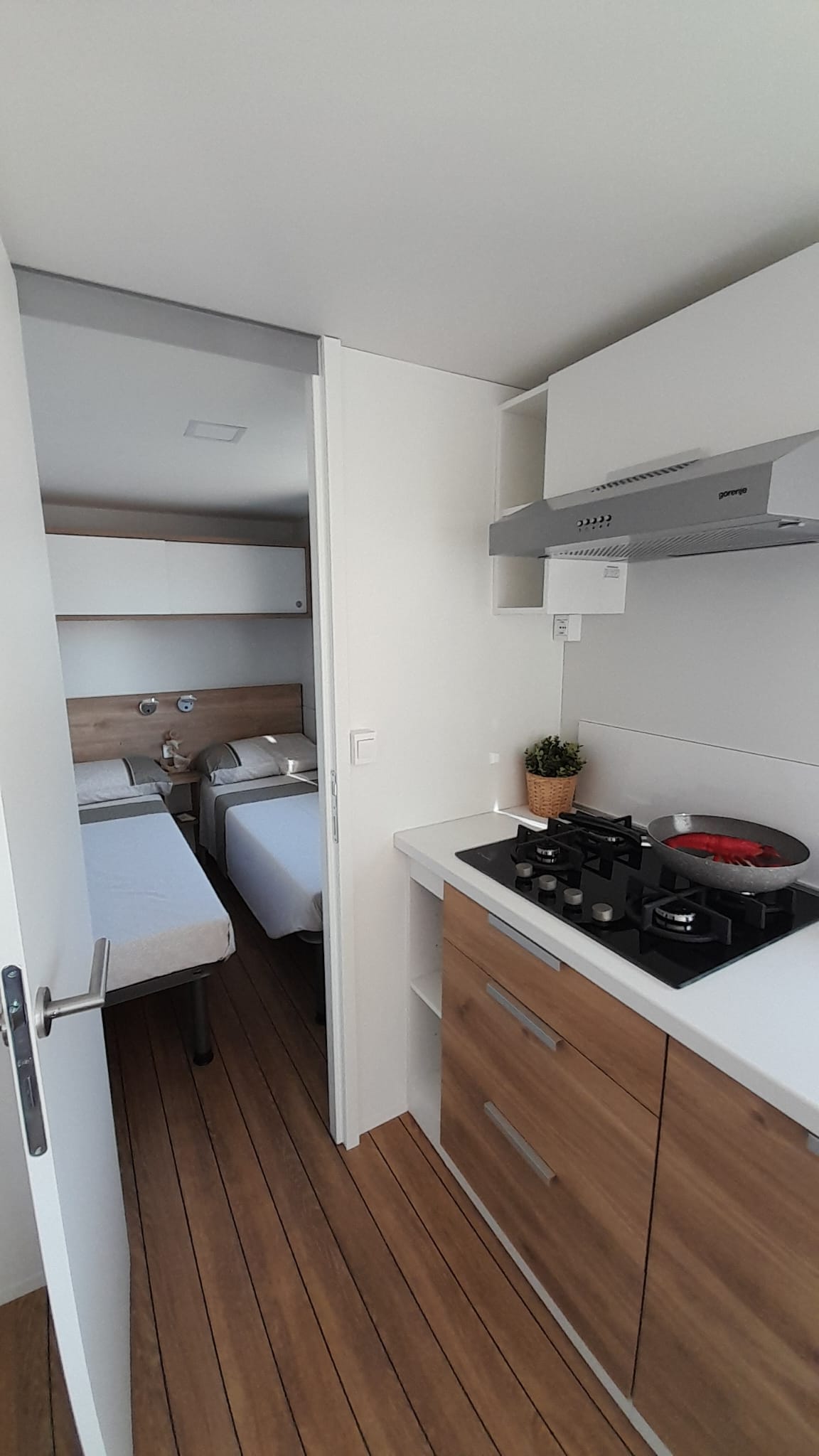 Situat la nord de camping, sub o pădure groasă de pini: alegerea ideală pentru vacanța ta. - Animale de companie permise - Verandă lemnoasă cu poartă și masă și scaune -Cameră de zi cu chicinetă echipată -Sofa -1 dormitor dublu -1 dormitor cu 2 paturi de o persoană (poate fi alăturat atunci când este necesar) -1 baie cu duș, lavoar - toaletă separată -TV și A/C