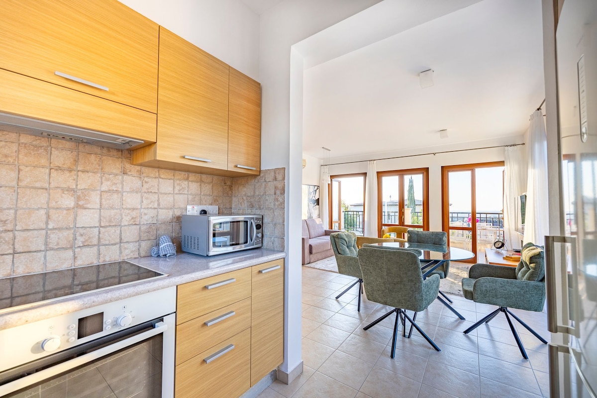 Situat în stațiunea de lux Aphrodite's Hills, renumită pentru terenul de golf internațional PGA cu 18 găuri. Confortabil pentru 4 persoane, cu canapeaua extensibilă din livingul mare și baia suplimentară cu toaletă și chiuvetă. La etajul 1, terasă mare în formă de L de 40 mp, priveliște uluitoare, Wi-Fi, parcare privată, la 2 minute de mers pe jos de piscina infinită cu vedere la Marea Mediterană. (NUMĂR DE ÎNREGISTRARE 0005369.) Ocazional, se poate produce zgomot în timpul zilei din cauza lucrărilor de construcții din apropiere.