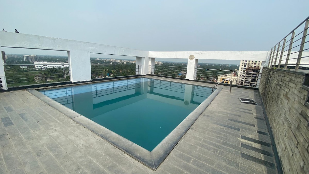 Casa noastră este în centrul orașului Newtown, Kolkata. Aeroportul internațional, autobuzul, metroul, cinematograful, mall-urile, piețele, spitalele, colegiile, birourile IT, atracțiile turistice și etc. sunt în apropiere. Vă oferim un hol spațios cu un smart T. V. , zonă de luat masa, o bucătărie bine utilată, 2 dormitoare cu aer condiționat, cu băi și balcoane atașate, constând din 1 pat king-size , 1 pat matrimonial și o saltea suplimentară care poate găzdui cel mult 6 persoane cu extra 800 INR pe noapte pentru al șaselea oaspete.