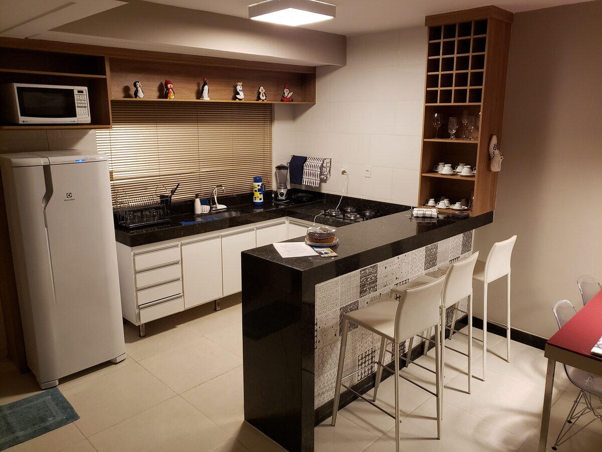 Casa este aproape de centrul orașului, de restaurante, supermarketuri, farmacii și magazine. Oferim lenjerie de pat, prosoape de baie, perne și pături. Casa are toate robinetele încălzite, Wi-Fi, Smart TV cu acces gratuit la Netflix și Globo Play, fier de călcat, uscător de păr, aer condiționat în dormitorul dublu și ventilatoare de tavan. Pană de curent în perdelele dormitorului Bucătărie completă cu toate ustensilele și dozatorul de apă. Grătar, hamac și poartă electronică.