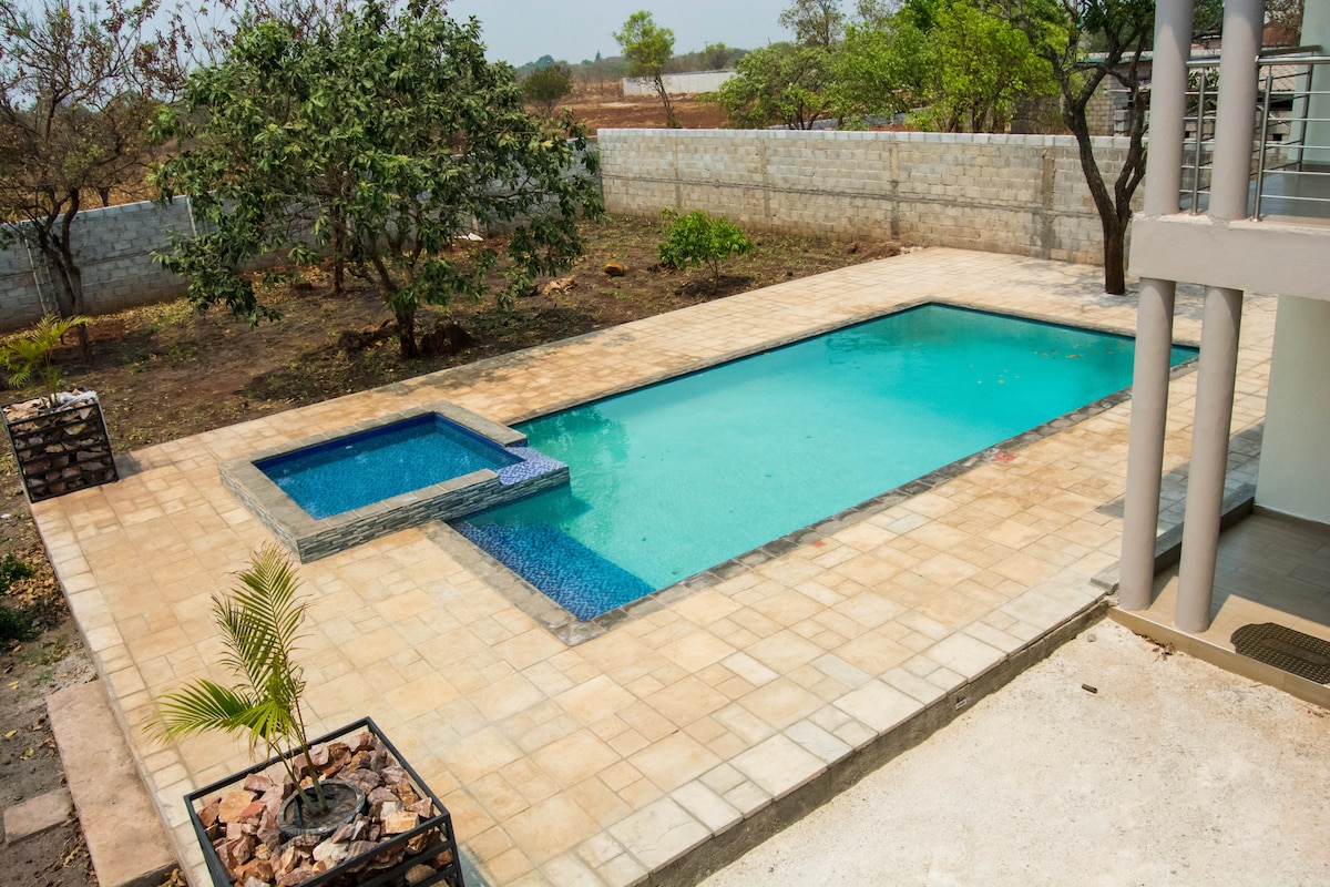 Casă centrală, dar liniștită, liniștită, spațioasă, cu grădini mature, luxuriante. Bucură-te de frumoasa piscină privată, relaxează-te în foișor, ascultă păsările și privește stelele noaptea lângă vatra de foc în serile răcoroase. Casa este dotată cu personal în timpul zilei, care te poate ajuta să gătești, să speli rufele și să te asiguri că ai un sejur confortabil, energie solară non-stop pentru toate dotările esențiale, Wi-Fi Starlink, sisteme de securitate de înaltă calitate și propriul foraj privat. Accesibil din Twin Palm sau Great East Road. Aproape de aeroport.