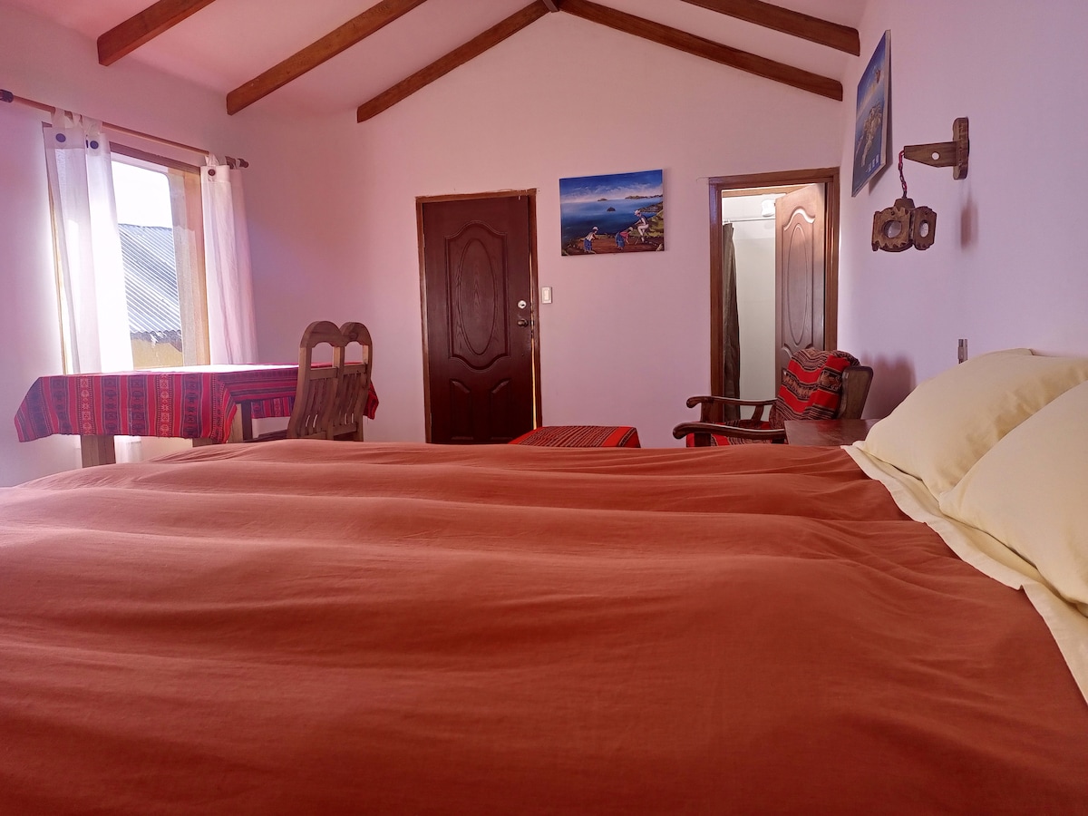 Relaxează-te în această escapadă unică și liniștită. Suntem o casă de țară a comunității Yumani. Această cameră are baie privată și o priveliște uimitoare cu lacul. Stilul nostru este de origine Aymara, cu obiecte și picturi de inspirație indigenă ancestrală. Avem un serviciu de restaurante. Participat de Martin și Justina, care îți vor oferi cele mai bune indicații pentru a explora Insula Sacră.
