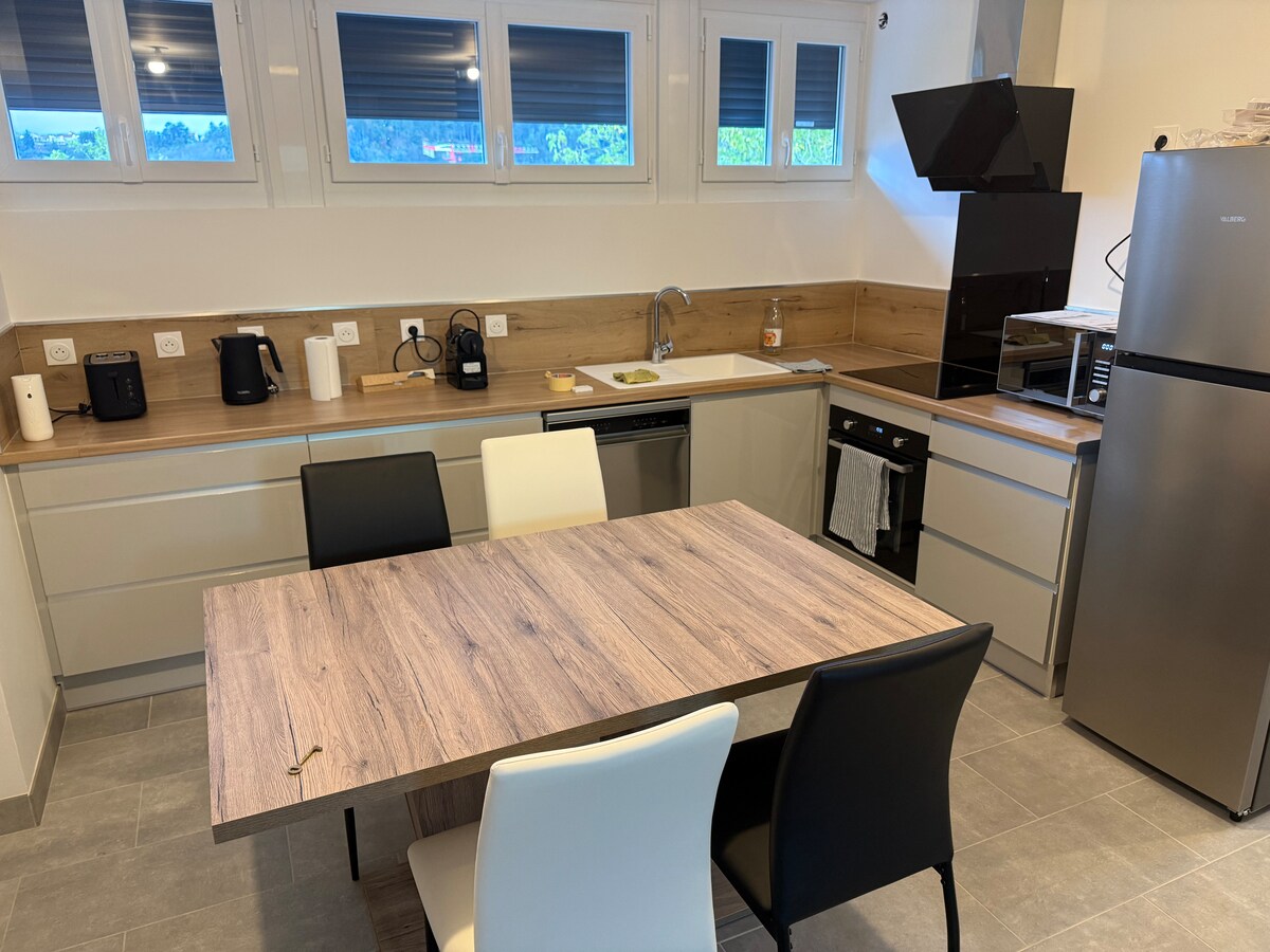 Cazare ✔️frumoasă de 50m2 + 11m2 terasă pentru a te bucura de apus în inima unei reședințe liniștite cu piscină ✔️Ideal situat pe traseul vinului la 2 minute de ieșirea de pe autostrada Chalon Sud și de magazine, la 5 minute de Framatome sau chiar de centrul orașului Chalon ✔️Dotări COMPLETE: Netflix ▪️TV/WIFI, bonus video, Disney+ Spațiu de stat în▪️ grădină, grătar ▪️Cafetieră Nespresso, cafea ▪️Mașină de spălat vase,mașină,cuptor cu microunde Așternuturi ▪️complete ▪️Prosoape, gel de duș ▪️Aer condiționat mobil, Dyson...