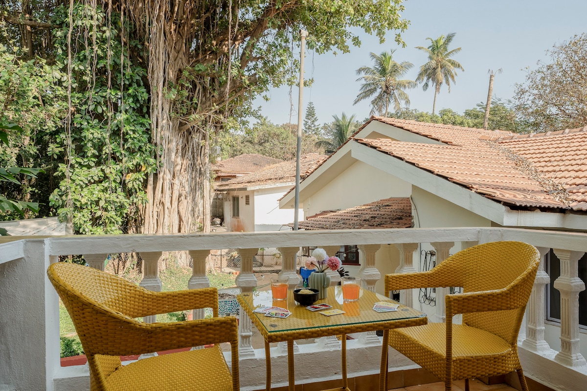 Walk through a charming lane lined with old Goan villas which leads you to a bright and cozy one-bedroom apartment. Just a relaxed five-minute walk from the beach. The sun-filled bedroom with a king-size bed overlooks lush greenery, while air-conditioning keeps you cool after warm summer days. A private balcony shaded by a majestic banyan tree offers the perfect spot for slow mornings and quiet evenings. The comfortable living area adds a warm, artistic touch to this calm coastal retreat.