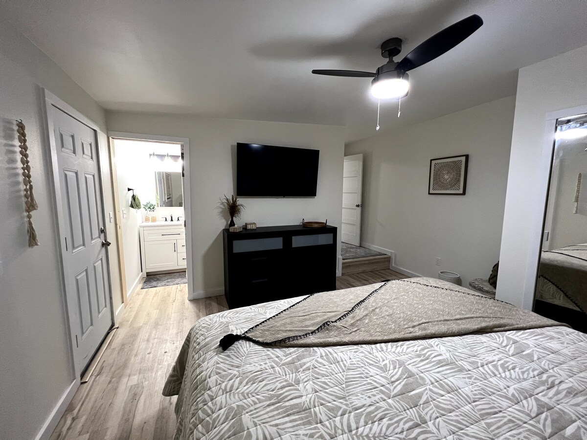 This fully furnished ground-level guest suite with expansive views is designed for comfort and ease, whether for short or extended stays. At 800 square feet, it features a clean, open-concept layout, thoughtful furnishings, and in-suite laundry facilities, which make settling in effortless. Two oversized sliding glass doors open to a deck with outdoor seating and Bay views that guests rave about. The living area features cozy seating, a smart TV on wheels for flexibility, and a workspace setup.