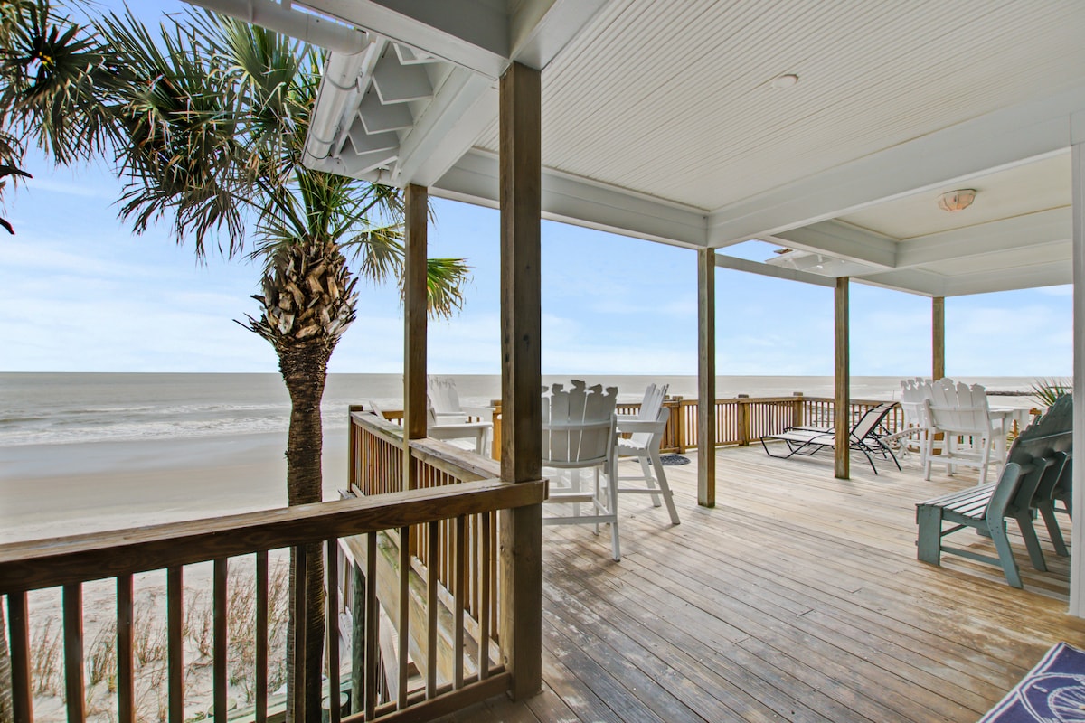 One of Folly's Best! This 4 BR 3.5 BA 2-story oceanfront home is located just 5 blocks from Center Street. Sea Palm is a slice of heaven on a narrow lot! An extremely comfortable home for up to 8 guests. Downstairs 2 queen, 1 bunk w/4 twins and laundry. Another queen upstairs w/en suite bath. Open kitchen/dining/living room, screened patio & deck w/ocean views. An outdoor shower, grill & porch swing downstairs too. Allows a maximum of 3 dogs with pre-approval.