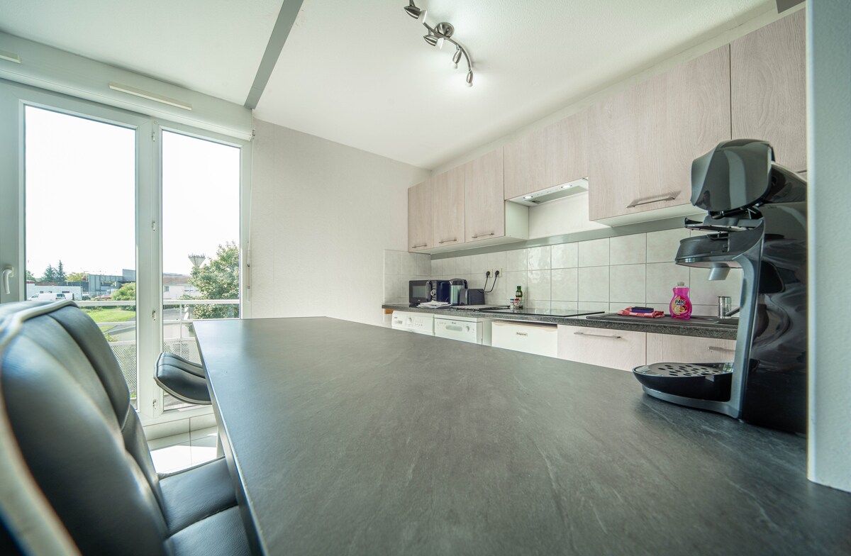 Situat la ieșirea de pe autostradă într-o locație liniștită și liniștită, apartamentul meu este soluția ideală pentru a te odihni și a te distra în Chalon sur Saône. Este echipat cu tot ce îți trebuie pentru șederea ta. Aproape de apartament aveți un supermarket🛍️, tesla și alte terminale pentru a vă încărca vehiculul⚡️⚡️, o sală de gimnastică de bază 🏋️♂️ și restaurante 🍕🥪🥙 Aștept cu nerăbdare să te întâmpin. 👍 Poziție: VĂ RUGĂM SĂ rețineți că este mai aproape de autostradă decât de centru